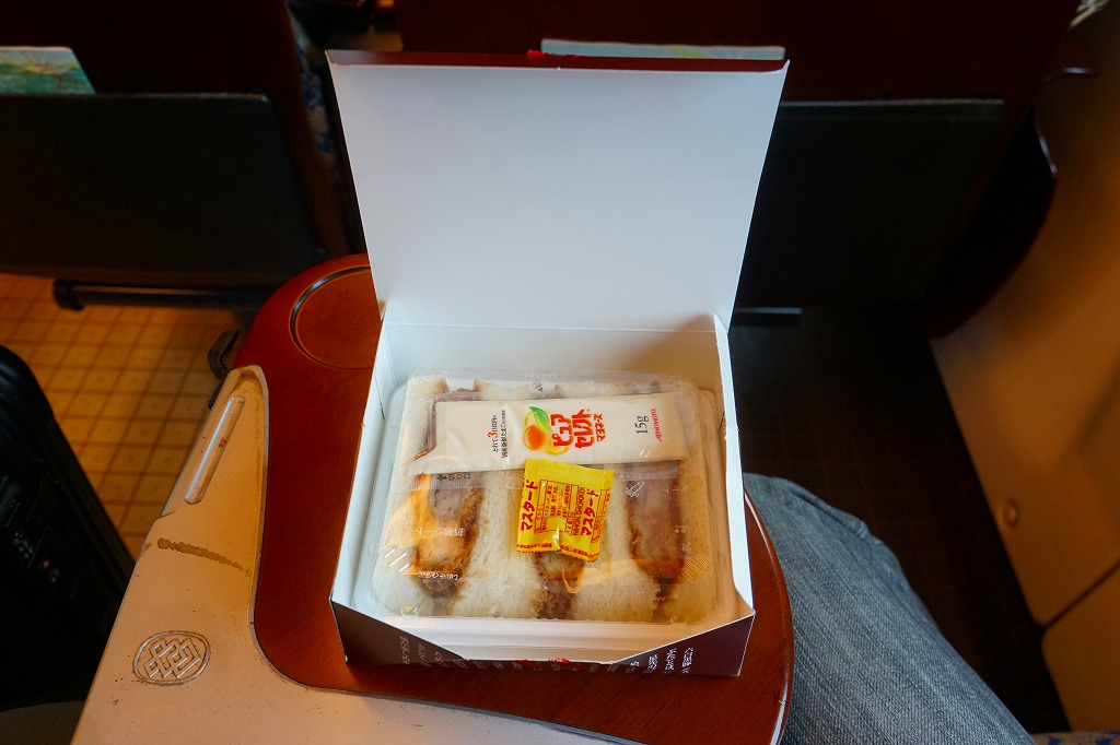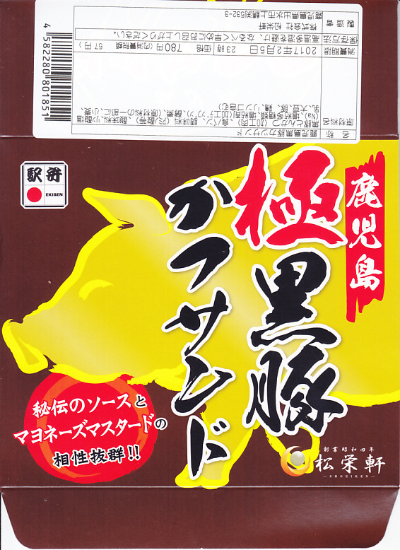 2017(平成29)年の発売か。ソース漬けにしたロースカツを塗ったパンに挟んで3切れ、マスタードやマヨネーズを別添し、白いプラ製トレーに詰め、商品名を描いた紙箱に収める。駅弁に限らずごく普通の、今風なカツサンド。2019年時点で博多松栄軒の博多駅弁になっている模様。価格は2017年の発売時で780円、2023年時点で830円、2024年時点で850円、2025年時点で880円。