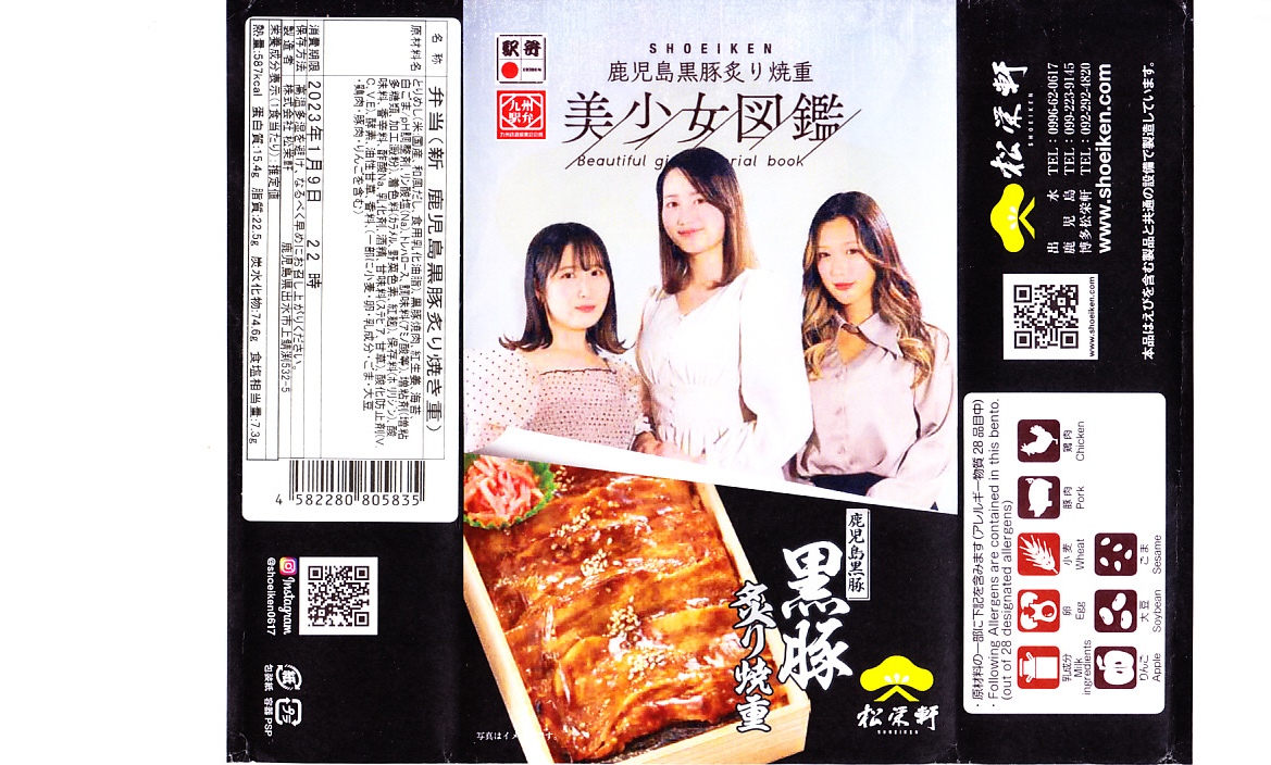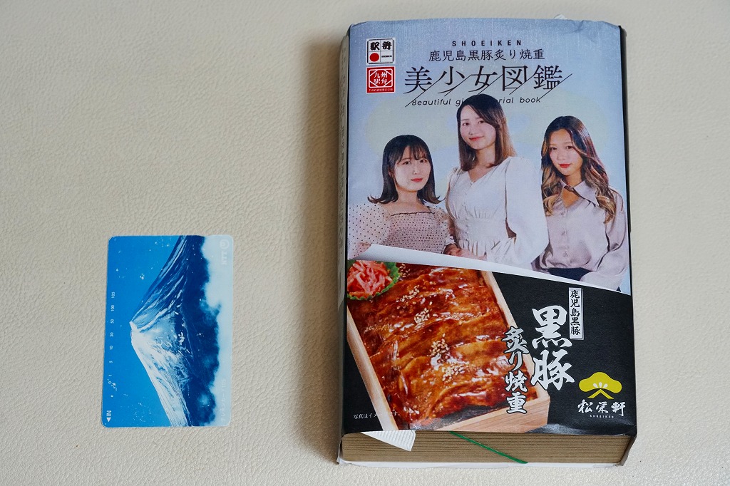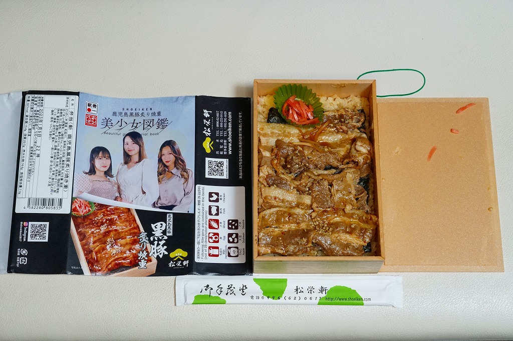 上半で「鹿児島黒豚炙り焼き重」、下半で「鹿児島黒豚黒豚炙り焼き重」、食品表示で「新鹿児島黒豚炙り焼き重」と、商品名が微妙に異なる掛紙には、中身の一部と女性3名の写真が使われる。中身は「とりめし」と表記された茶飯を、海苔と黒豚焼肉で覆い、紅生姜を添えた、豚焼肉丼。つまり2022年の秋の新商品「鹿児島黒豚黒豚炙り焼重」の、掛紙を替えたもの。東京や大阪や福岡や鹿児島の駅でおなじみの、安全な味といえる。