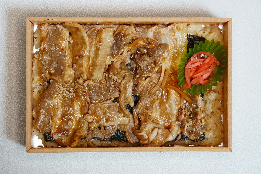 秋冬の駅弁大会シーズンに向けた、2022(令和4)年秋の新商品か。10月のJR九州の駅弁キャンペーン「第13回九州駅弁グランプリ」にエントリー。長方形の容器になぜか「とりめし」を詰め、海苔で覆い、黒豚炙り焼と表現する豚焼肉で覆い、紅生姜を添える。これとまったく同じ駅弁は過去に無いようだが、同じく思える内容には、上記や下記のとおり今まで度々出会ってきており、写真をよく見比べなければ違いが分からない。強いタレの味で茶飯を食べる、肉が豚でも牛でも鶏でも、違いが出ないかもしれない内容に感じた。価格は2022年の発売時で1,250円、2025年時点で1,320円。