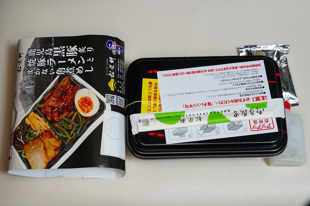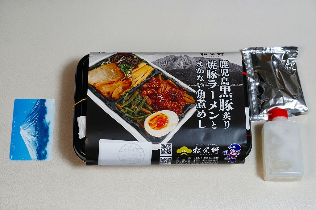 2025(令和6)年1月の京王百貨店の駅弁大会で、出水駅の駅弁として実演販売。今回の催事場で水戸駅「常陸牛牛べんとあんこう味噌ラーメン弁当」と新千歳空港駅「駅めん吉山商店×美食千歳」との「よくばりコラボ!駅弁×ご当地ラーメン」企画を担った。商品名と桜島と中身の写真を使う黒い掛紙を巻いた、長方形の加熱機能付き容器に、ラーメンを詰めてチャーシューに思える炙り焼豚とメンマとキクラゲで覆いネギを載せ、茶飯を詰めて黒豚角煮や煮卵と山菜やごぼうで覆う。ラーメンのスープを添付。駅弁にしてよかったためしがないと思うラーメンと、いつもの鹿児島中央駅弁の味の詰合せ。調製元のインスタグラムによると、出水駅前の本社工場で2月7日から前日までの予約販売を始めたというが、買った食べたという話は聞かれない。調製元の公式サイトにも載ってない。