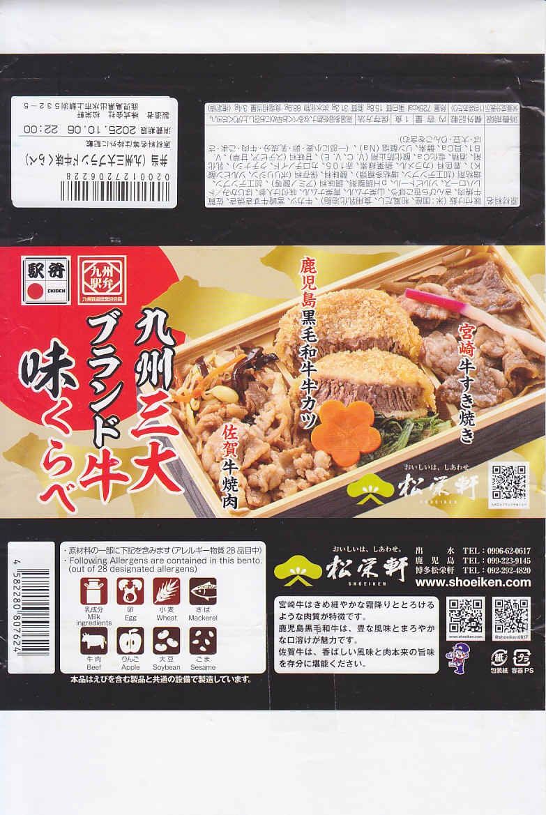 2025(令和7)年10月に全国で発売か。10月からのJR東日本の駅弁キャンペーン「駅弁味の陣2025」にエントリー。10月からのJR九州の駅弁キャンペーン「第16回九州駅弁グランプリ」にもエントリー。長方形のプラ容器3区画すべてに茶飯を詰め、佐賀牛焼肉と山菜ナムルと花にんじん、鹿児島黒毛和牛牛カツと青菜ナムル、宮崎牛すき焼きときんぴら笹ごぼうとはじかみで覆う。
