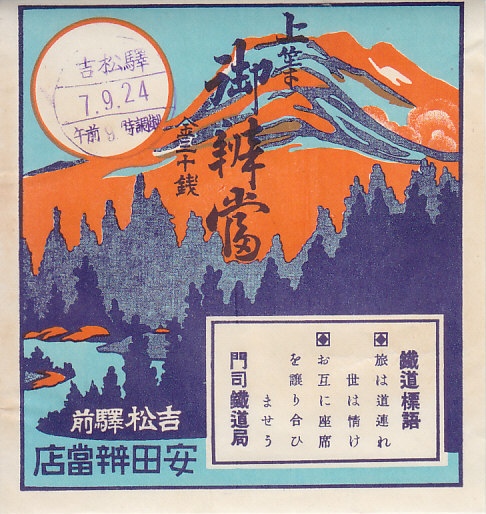 1932(昭和7)年9月24日9時の調製と思われる、昔の吉松駅弁の掛紙。実際にはここまで険しくないと思うが、鉄道の難所である肥薩線の矢岳越えに向かう山々を描いたものか。調製元の安田弁当店は、後の吉松鉄道構内営業からたまりへつながる、大正時代からの吉松駅の構内営業者。