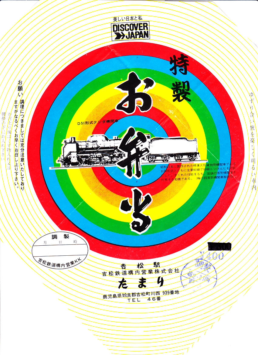 1974(昭和49)年12月2日10時の調製と思われる、昔の吉松駅弁の掛紙。蒸気機関車D51を細密に描く。価格を400円に訂正し使用。調製印の欄を使わず、別に調製印を押した。D51は実際に、昭和40年代にも肥薩線の矢岳越えで使われた。