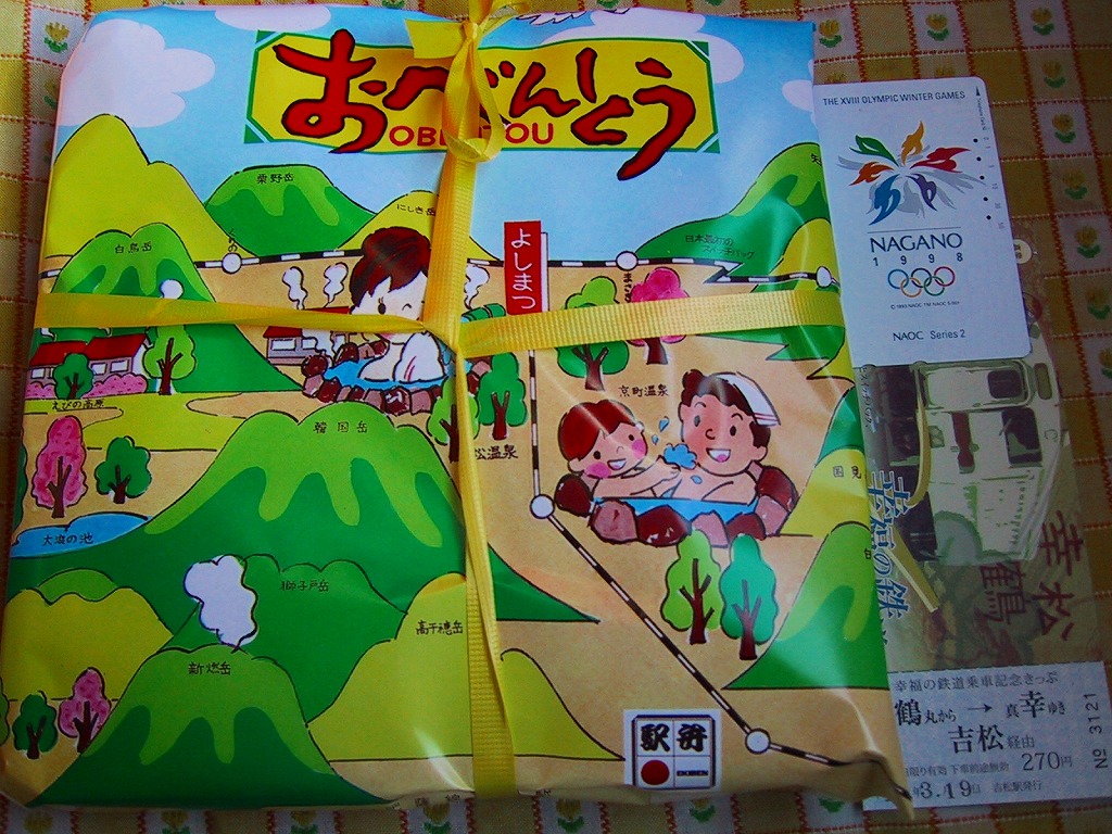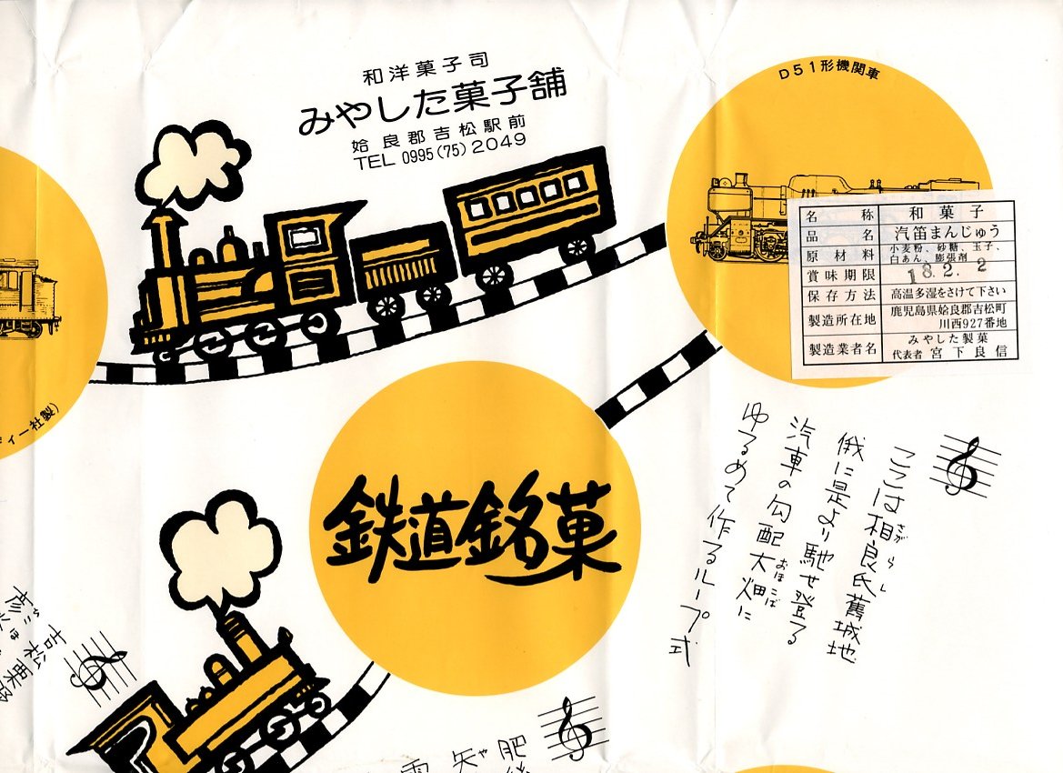 鉄道の町である吉松の銘菓。発泡スチロールのトレーを入れた白いボール紙の箱を、SL絵柄の包装紙で包む。赤いビニールで個別包装された中身は、かつてパン屋さん等で売られていた甘食の中に白あんを詰めたような、甘い甘い揚げ饅頭。