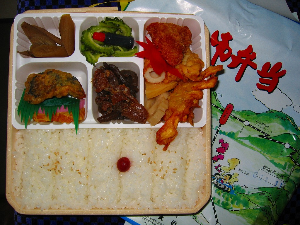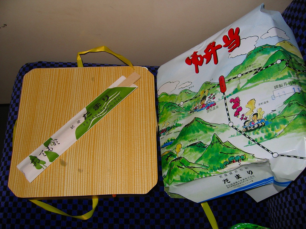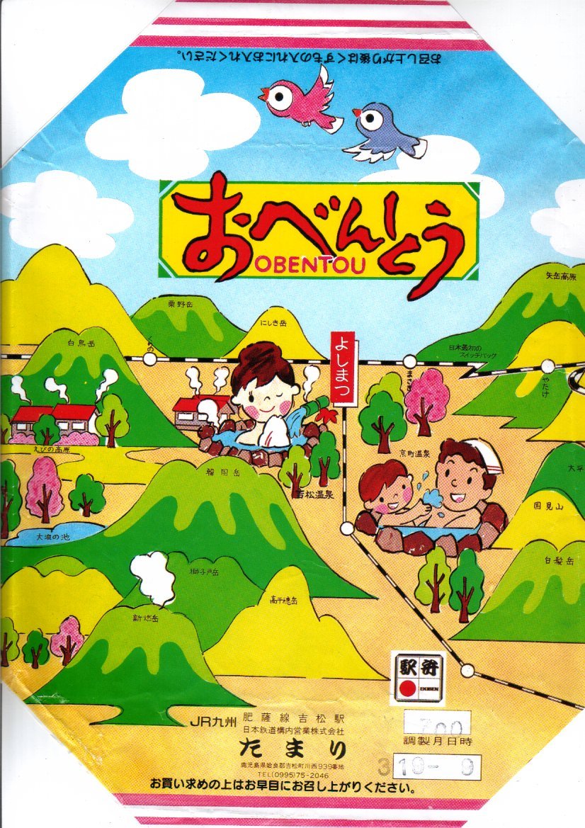 底面に経木を使った正方形の容器を、駅周辺の俯瞰イラストを描く掛紙で包み、ビニールひもでしばる。中身は前回収穫の「おべんとう」と同じく、ホカホカ御飯と冷蔵おかずの組み合わせで、細長日の丸俵飯にかき揚げ、揚げナス、かまぼこ、玉子焼、ゴーヤーなど。他の収穫報告を見ると、おかずの種類は一定していない模様。駅弁文化を楽しむためのお弁当。「九州鉄道構内会」公式サイトによると、吉松駅の幕の内弁当は3種類が存在するというが、この1種類しか見たことがない。駅弁屋の閉店により、2018(平成30)年9月限りで終売。