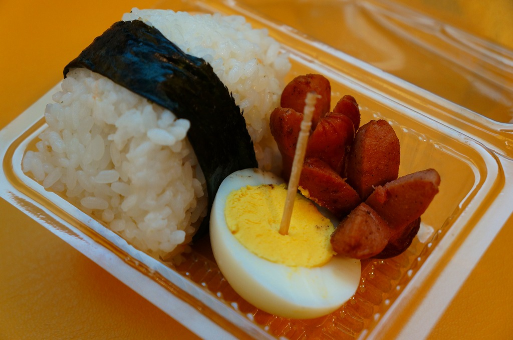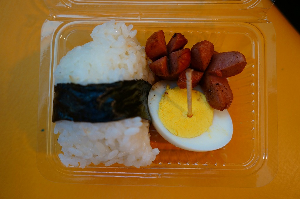 これは駅弁ではなく、伊江島と沖縄本島の本部を結ぶ村営フェリーの売店で販売されていた惣菜のひとつで、とても細い海苔を締めた鮭の三角おむすびに、ゆで卵を半分と、タコ状ウインナー揚げ2個を添えたもの。