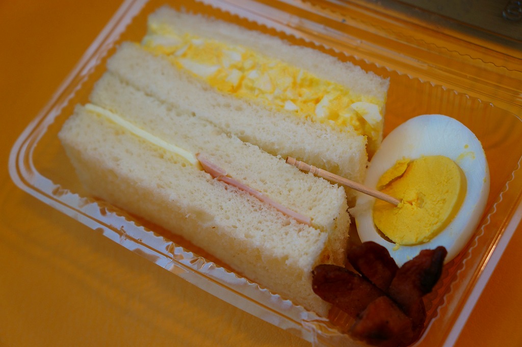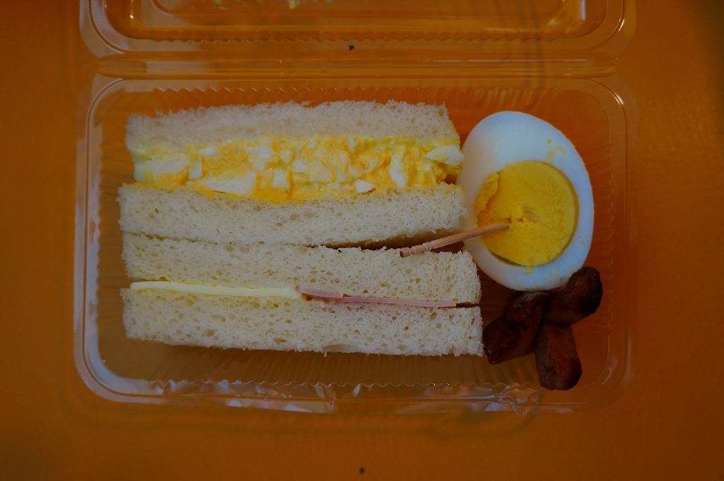 これは駅弁ではなく、伊江島と沖縄本島の本部を結ぶ村営フェリーの売店で販売されていた惣菜のひとつで、とても小さな透明のプラ製の惣菜容器にタマゴサンド、ハムチーズサンド、半分のゆで卵、タコ状ウインナー揚げを詰めていた。