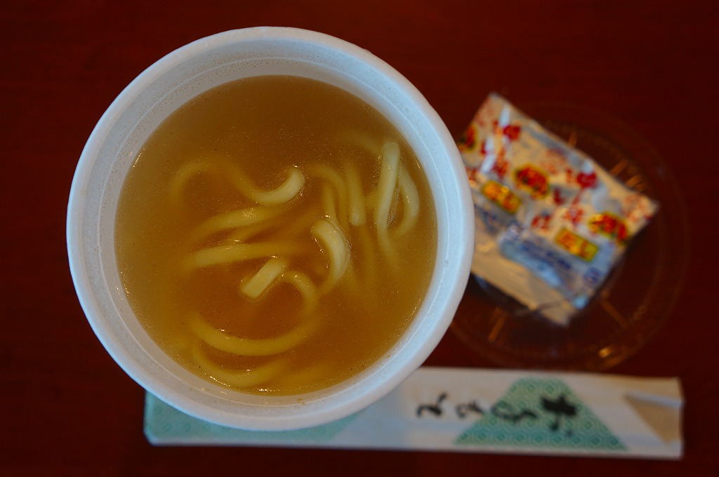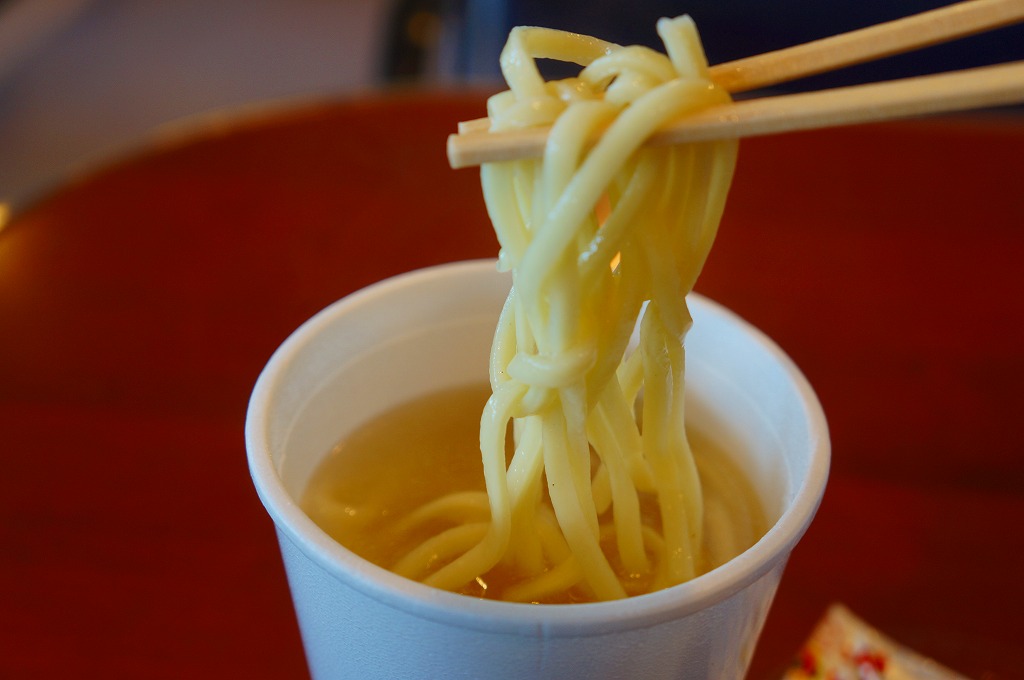 これは駅弁ではなく、伊江島と沖縄本島の本部を結ぶ村営フェリーの売店で販売されていた持ち帰り商品。注文すると麺入りカップにスープを注ぎ、袋入りのだしを添えてくれる。具はまったくないけれど、味はだいたいあの沖縄そば。列車内からも船着き場からも船内からも売店がどんどんなくなる昨今、片道わずか30分の生活路線でこんなものに出会えるとは思わなかった。