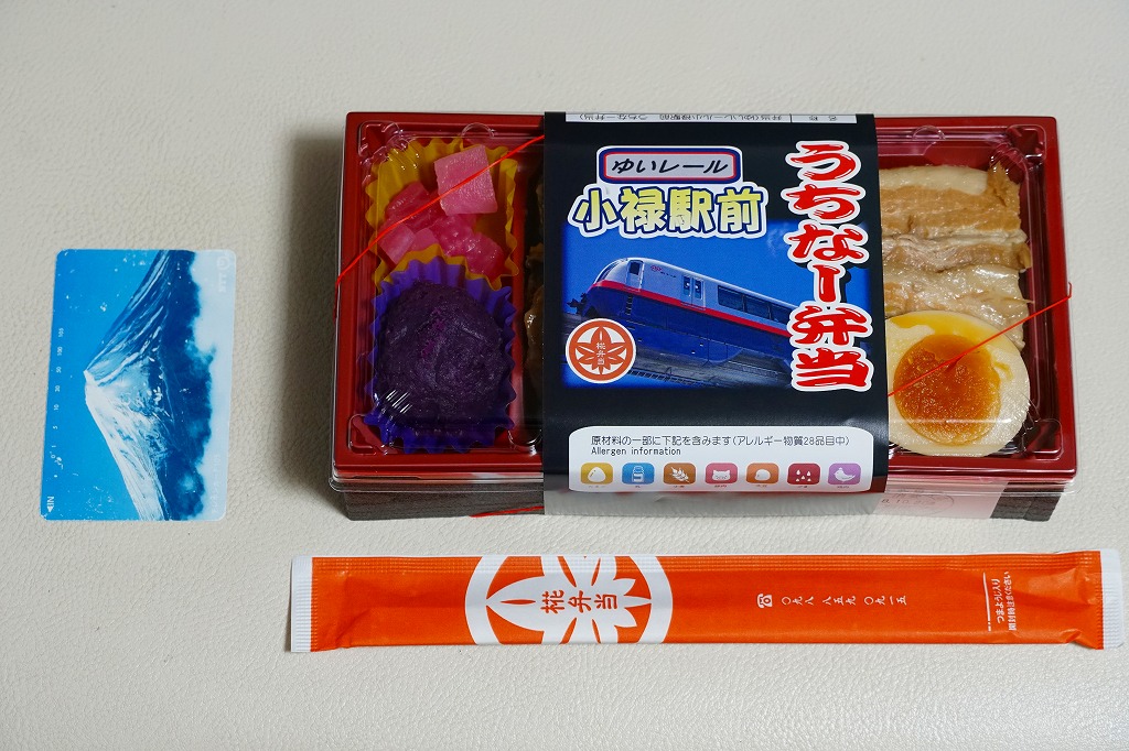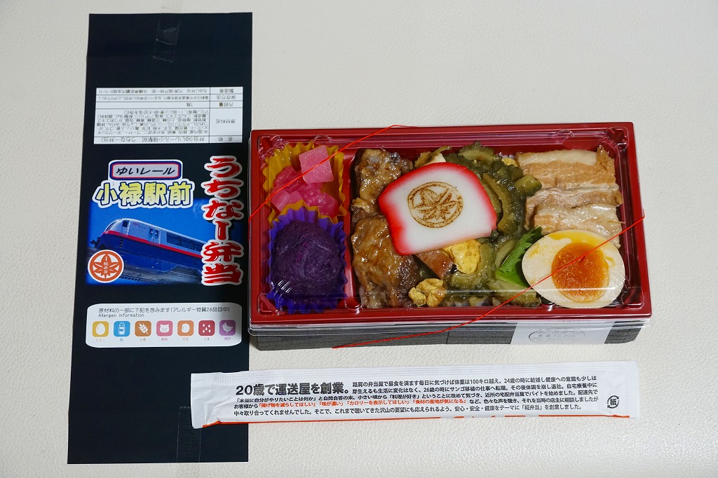 商品名が書かれた掛紙には、ゆいレールの電車の写真が使われる。長方形のプラ容器に白飯を詰め、らふてぃ、軟骨ソーキ、ゴーヤーちゃんぷるーで覆い、赤かまぼこと煮玉子を載せ、ドラゴンフルーツと大根の甘酢漬けと紅芋のマッシュを添える。現物で特に解説をしなくても、旅行者でも那覇や沖縄本島に何度か来ていれば、きっと実に沖縄らしい弁当だと感じさせてくれる内容を、1食分でコンパクトに詰めていた。冷めてもおいしく駅弁らしい弁当、見た目も良い弁当にしたためか、沖縄のお店では見られないような高額な弁当になったと思う。