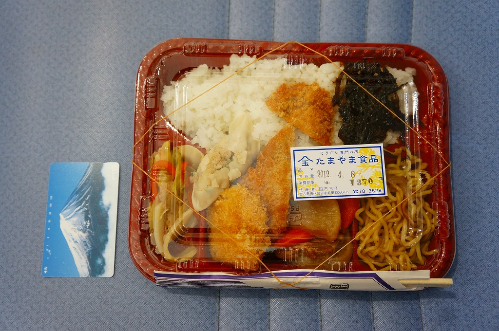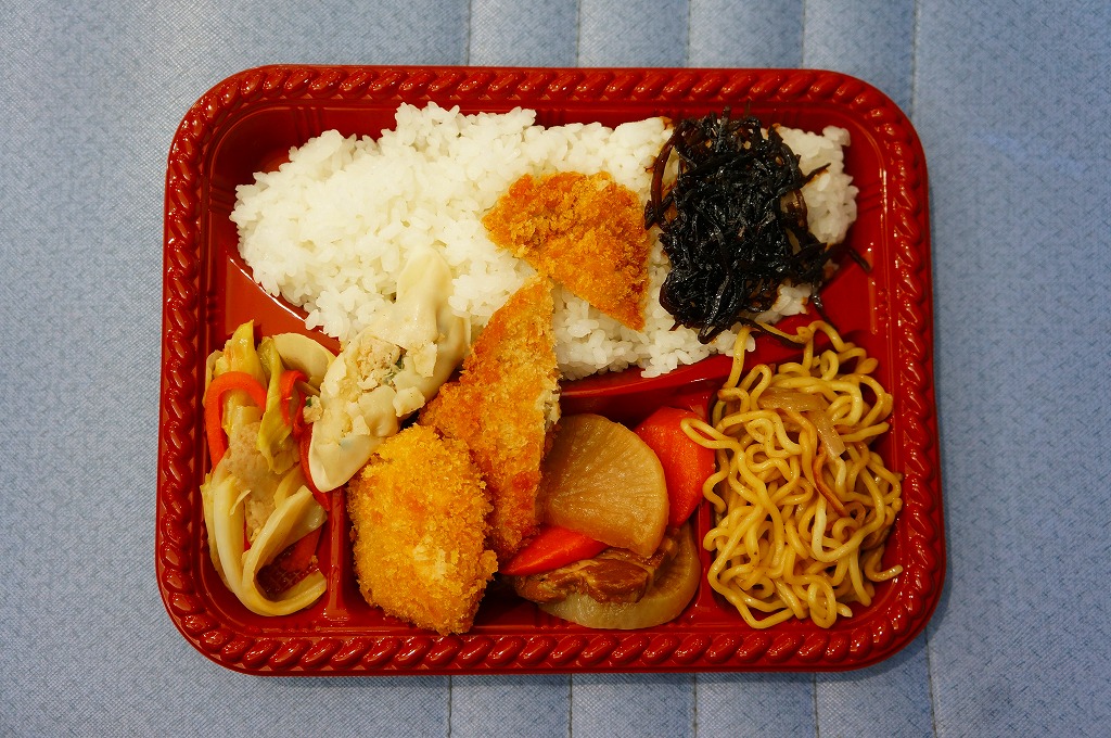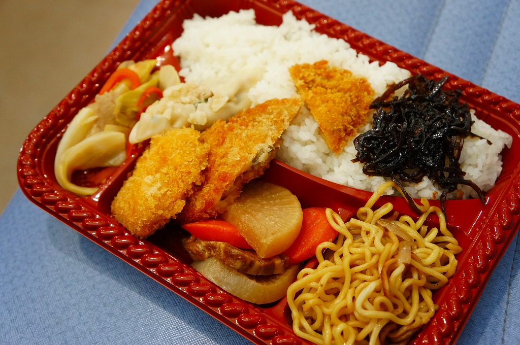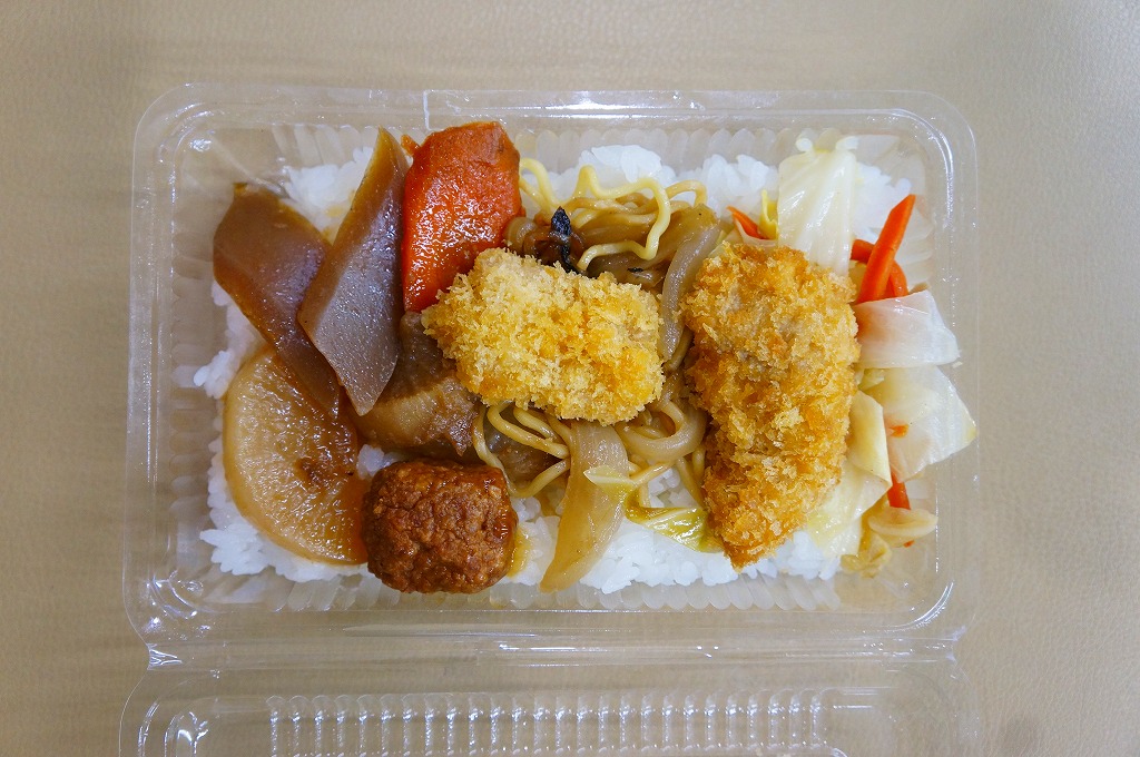 これは駅弁ではなく、宮古島へのフェリーが発着する伊良部島の佐良浜(さらはま)港の売店で売られていた惣菜。透明で簡易なプラ製の惣菜容器に白御飯を敷き、焼きそば、フライ、肉団子、こんにゃくとダイコンとニンジンの煮物、キャベツとニンジンの炒め物、塩焼きそばを載せるもの。こういう格安で珍妙な市販メニューもまた、沖縄の名物であるような気がしてきた。