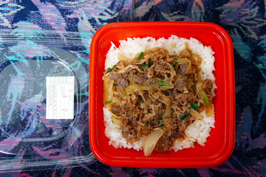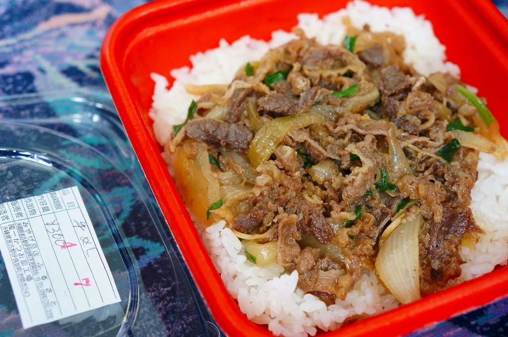 これは駅弁ではなく、宮古島へのフェリーが発着する伊良部島の佐良浜(さらはま)港の売店で売られていた惣菜。小柄な牛丼。白御飯の上に固く油っぽい牛肉煮が置かれる。この他に三角形や四角形のおにぎり、ハンバーガー、御飯に炒め物を載せた弁当など、油っぽく健康に悪そうだと見える惣菜が10種類以上販売されていた。船弁や港弁というほど飾りのあるものではない、日用品かつ実用品。