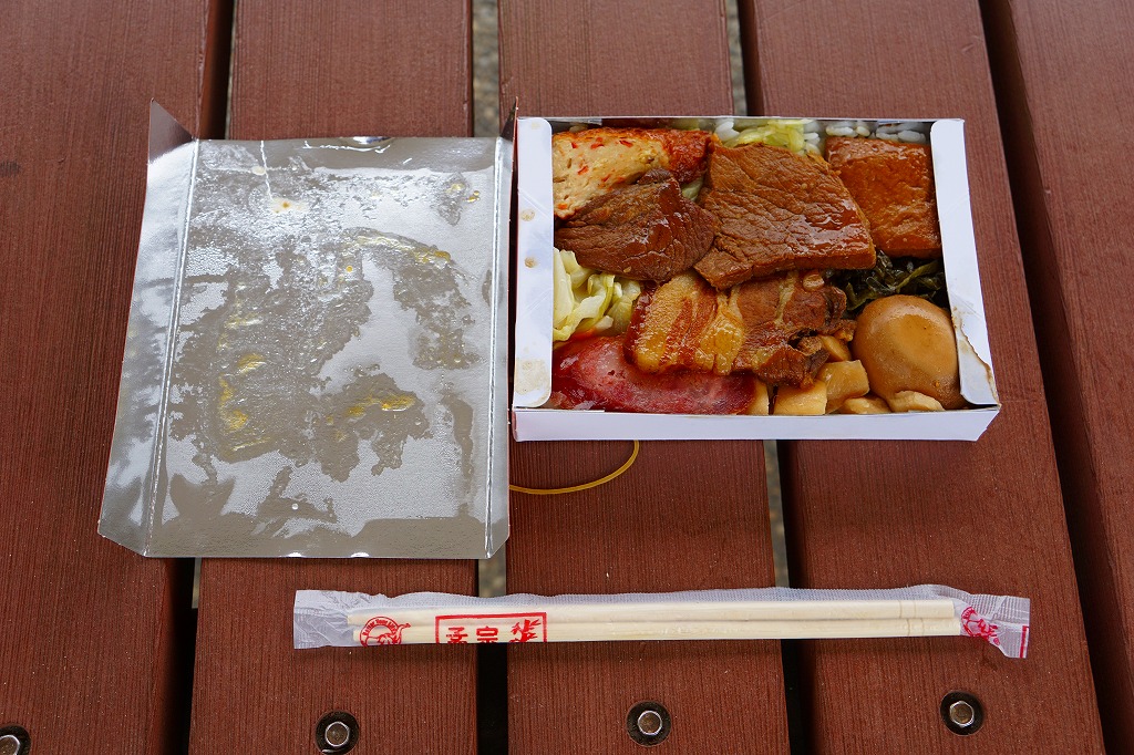 日本の牛乳パックに使われるような素材の紙を容器に使う。中身は台北駅のものと同じく、白御飯の上にスペアリブを載せる「排骨飯」で、やはり味付け卵がまるまる1個添えられるが、高菜は入らずハムとグリーンピースに油揚げが入る。