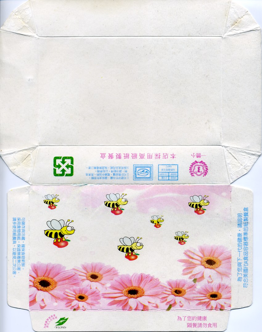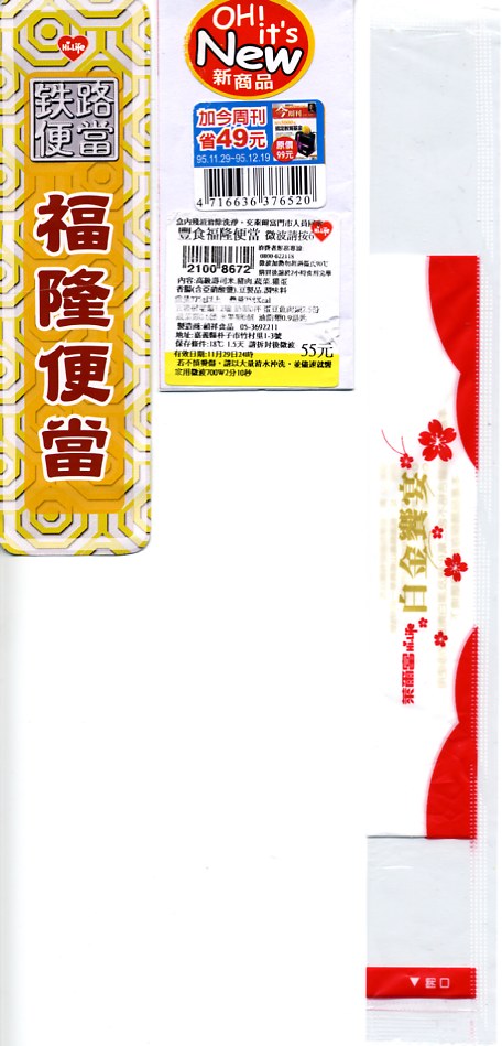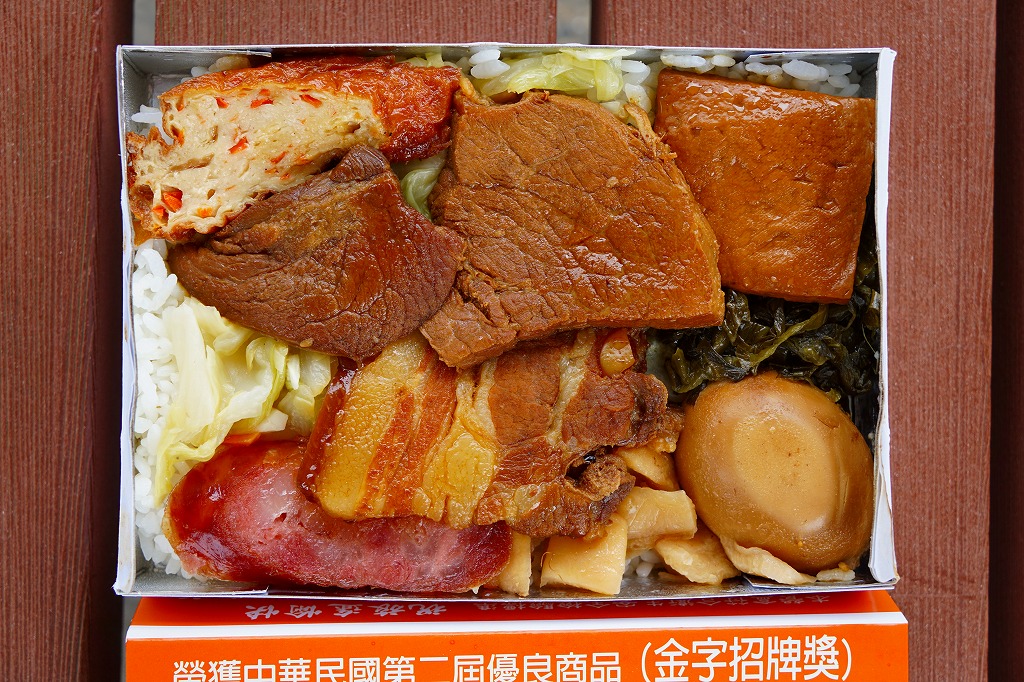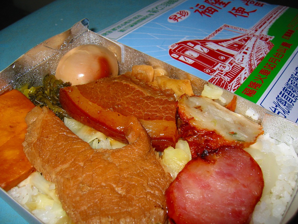 長方形の薄い紙箱に、自強号用電車の版画を描いた紙ふたをかけて、竹箸を置いて輪ゴムでしばる。中身は白御飯の上に高菜やキャベツの炒め物を敷き、煮玉子1個、固い豆腐のようなもの、薩摩揚げを添え、豚肉を揚げ、角煮、サラミ、アメリカンドッグの4種で載せる。風味は台湾駅弁らしく、だいぶ油っぽい。