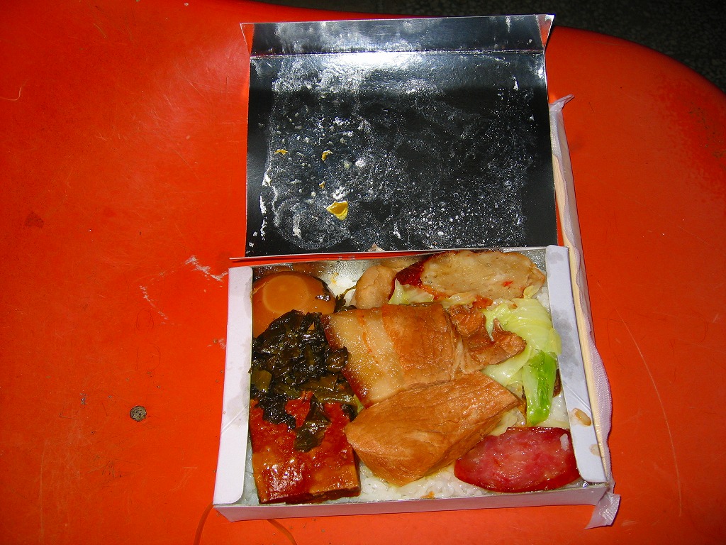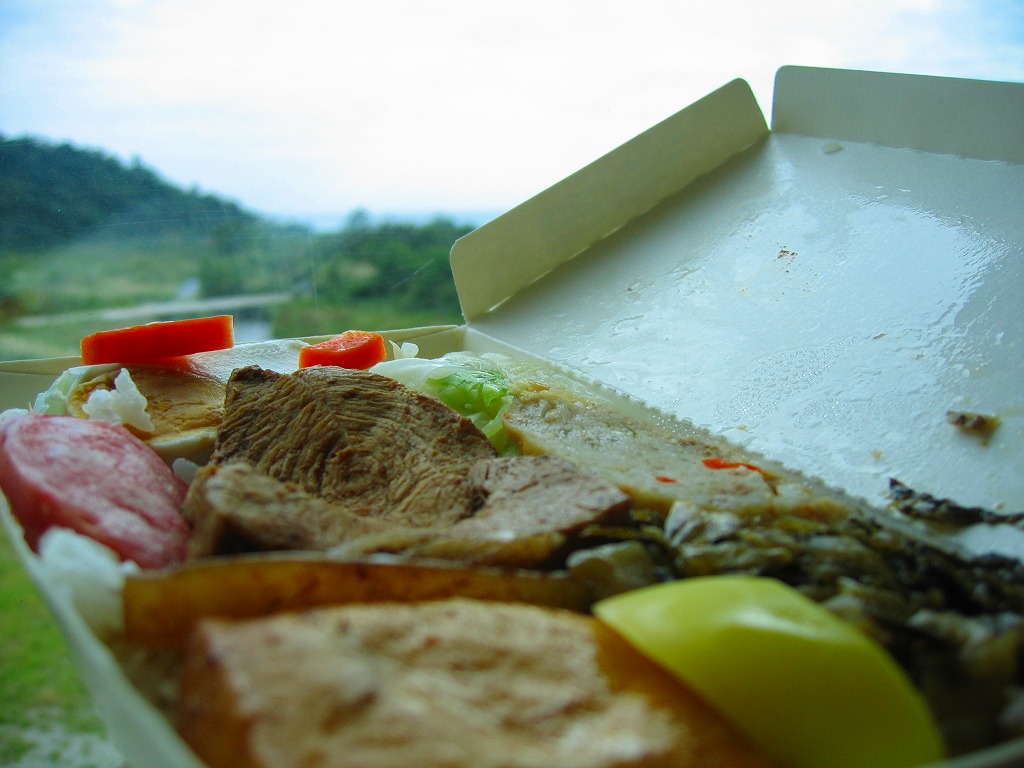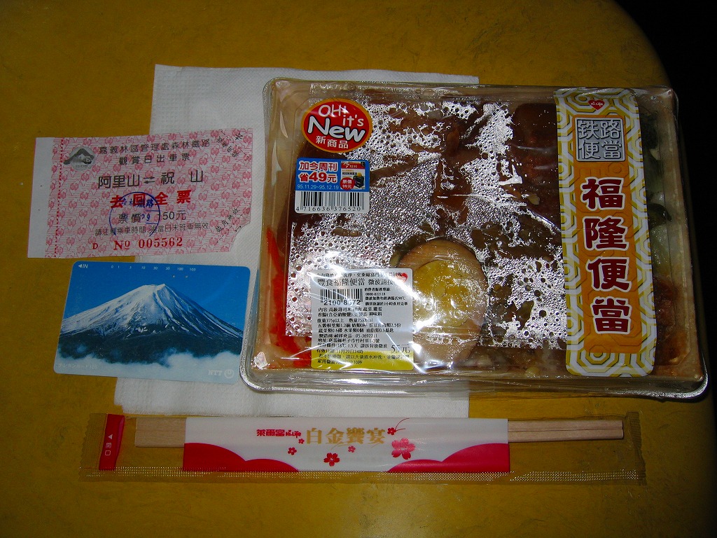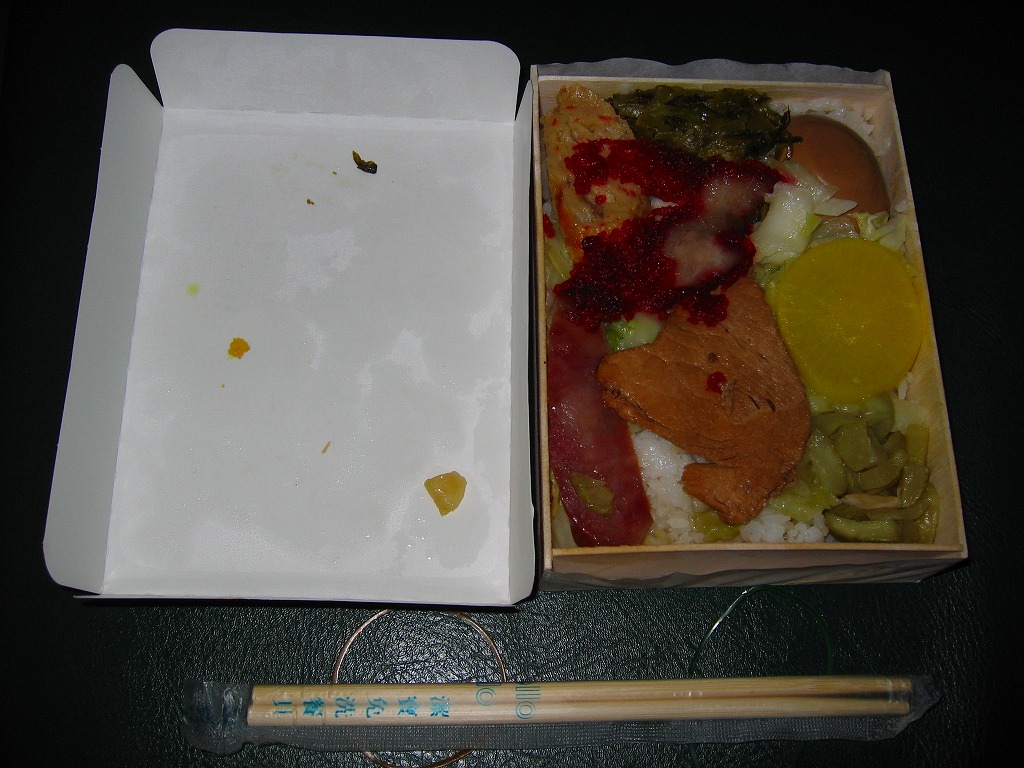 阿里山森林鐵路の阿里山駅(2006年時点で休止中)に近いコンビニで買ったお弁当。紙を貼って組み立てた経木の容器に透明なふたをかけて、商品名や食品表示ラベルを貼ってラップで包む。中身は白御飯の上に煮玉子半分、野菜炒め3種、豚肉4種などを載せるもの。電子レンジで加熱のアツアツ状態で食べたので、駅弁というより屋台や食堂の味。