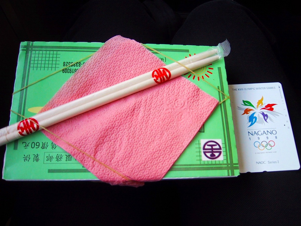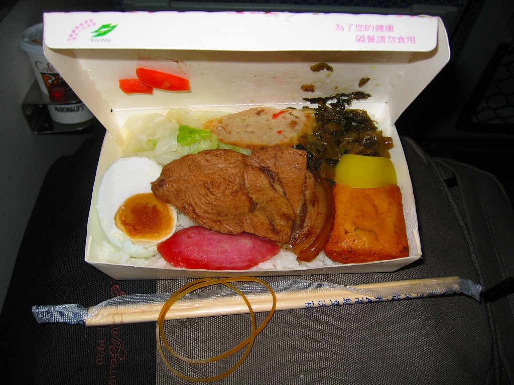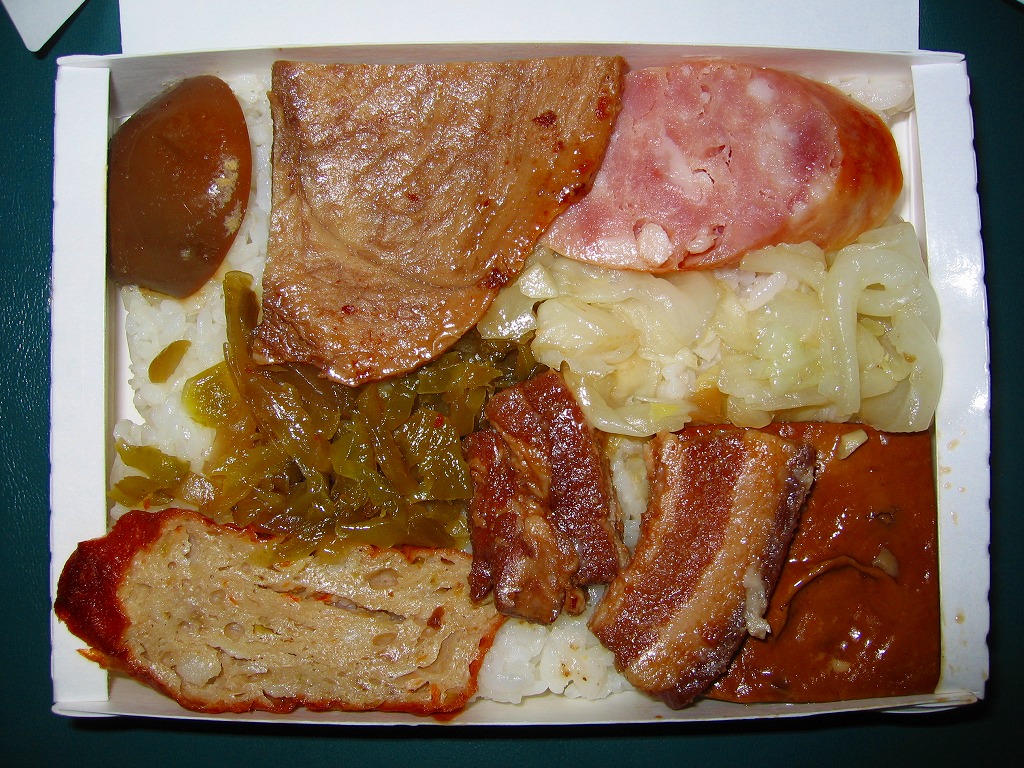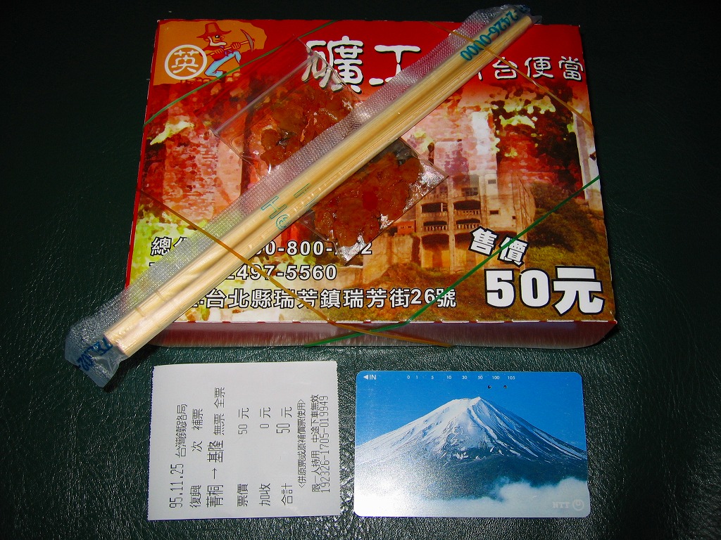 阿里山森林鐵路の阿里山駅(2006年時点で休止中)に近いコンビニで買ったお弁当。紙を貼って組み立てた経木の容器に透明なふたをかけて、商品名や食品表示ラベルを貼ってラップで包む。中身は白御飯の上に煮玉子半分、野菜炒め3種、豚肉4種などを載せるもの。電子レンジで加熱のアツアツ状態で食べたので、駅弁というより屋台や食堂の味。