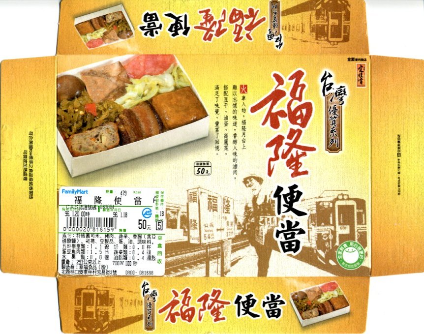 台北市内のファミリーマートで買った福隆弁当。素材は駅弁らしく、しかし現地販売版とは少々異なる紙箱には、駅名標と駅弁立売と普通電車が描かれる。中身は白御飯を詰め、豚角煮、野菜炒め、サラミ、煮玉子、薩摩揚、固い豆腐のようなものを載せる、つまり福隆弁当。排骨飯よりこちらのほうが、日本人の口に合うと思うし、コンビニ弁当なのでさらにクセが小さい。