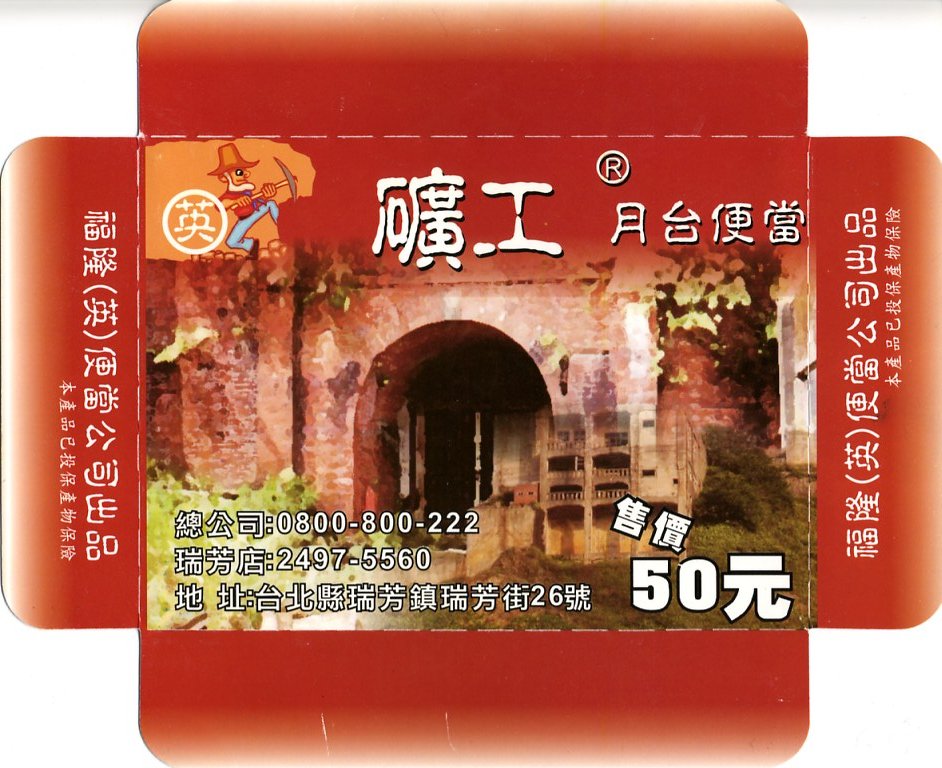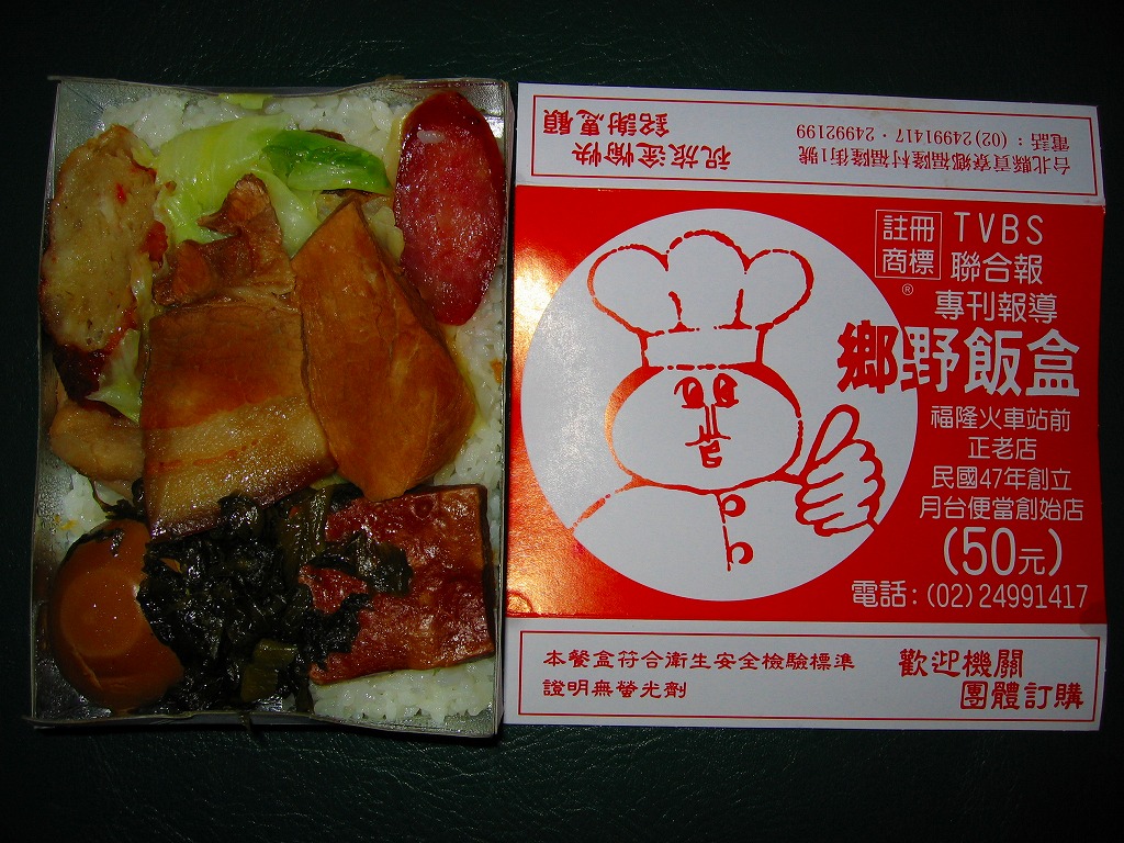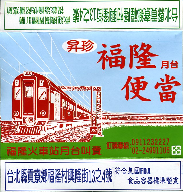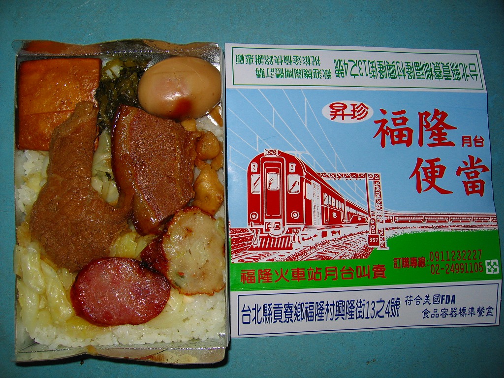 福隆駅前に何軒もある弁当屋のうち、最も駅に近く、訪問時に最も賑わっていた店で買った福隆弁当。駅弁と同じ構造の容器を使用、フタにはコックの絵とおそらくテレビで紹介された旨の宣伝文句を書く。中身は駅弁とだいたい同じで、具が少々大きく、キャベツ炒めの緑色が色彩を補い、風味もなんとなく、いい感じ。これを販売箇所を兼ねる店奥の調理場で激しく量産していた。