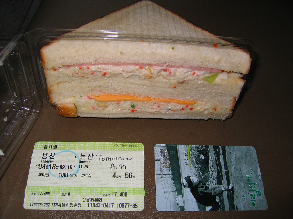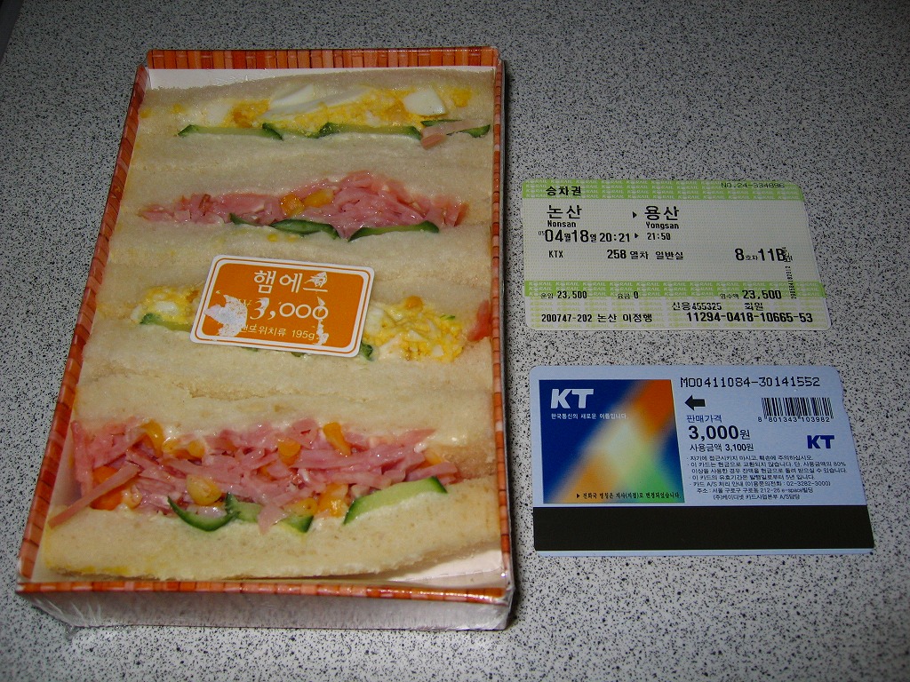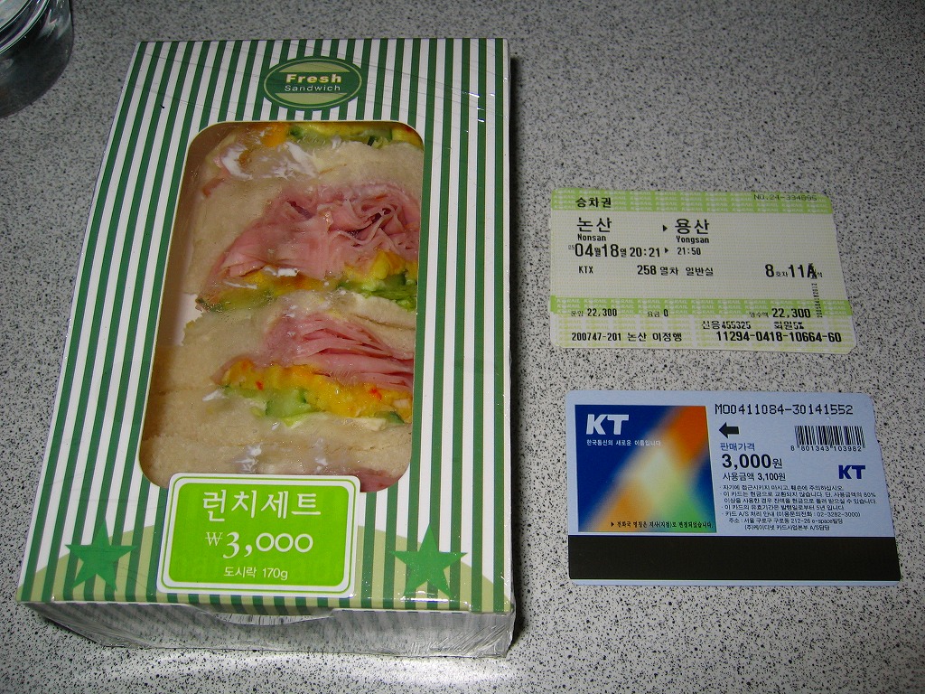 このサンドはKTX車内で消費。フランスのTGVをまるごと移籍して2004年3月に開業した、世界最高速タイの時速300km営業運転を誇る韓国鉄道の顔であるが、狭い車内と高い運賃に不具合の続発など評判があまり芳しくないようで、利用者は見込みの半分程度だという。駅電光掲示板の空席情報でも、セマウルやムグンファが満席でもKTXは数百席の空席数を示し、実際に空いていた。今後に予定される第二期開業と国産車導入で挽回してくるだろう。
