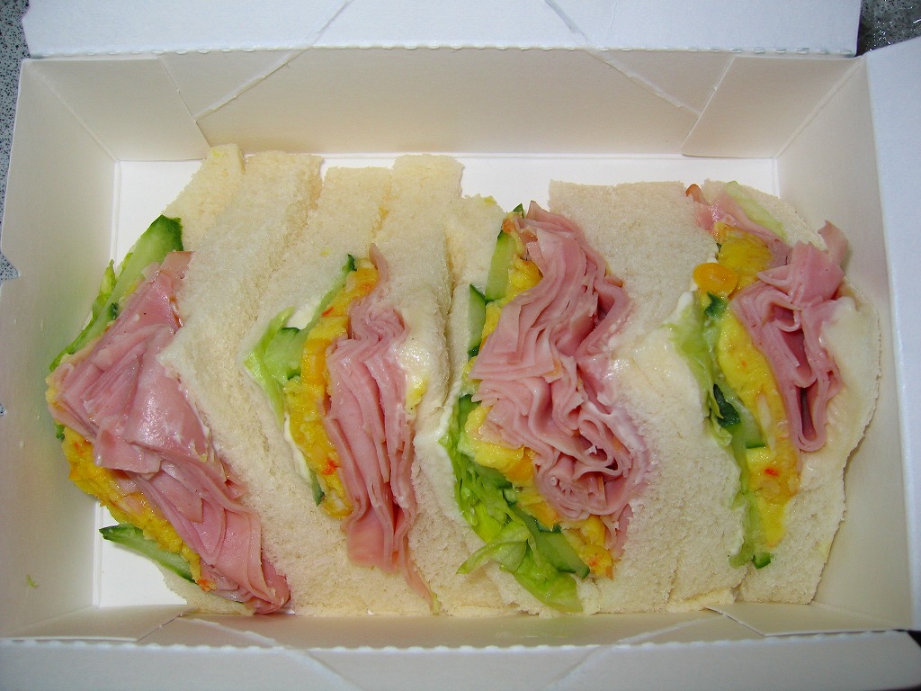 龍山駅のKTXやセマウル号などが発着するホーム上のファミリーマートで買った箱入りサンドイッチ。ハム・玉子・キュウリ・レタスのサンドイッチを4切れ、小さな紙箱に直角二等辺三角形の直角を上に詰めるもの。その価格と容姿から高級系なのだろう、コンビニサンドやソウル駅収穫品より少々のみずみずしさと高級感がある。同じタイプの商品がもう1種類あった。