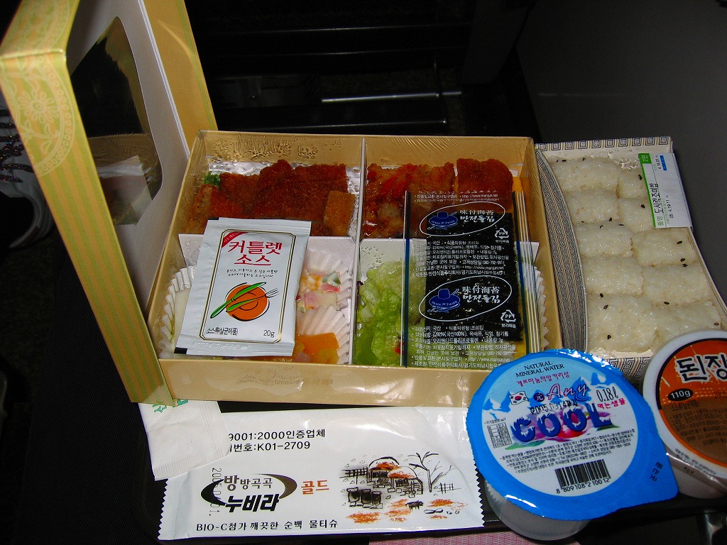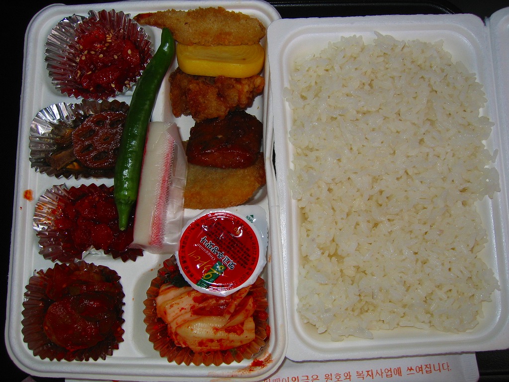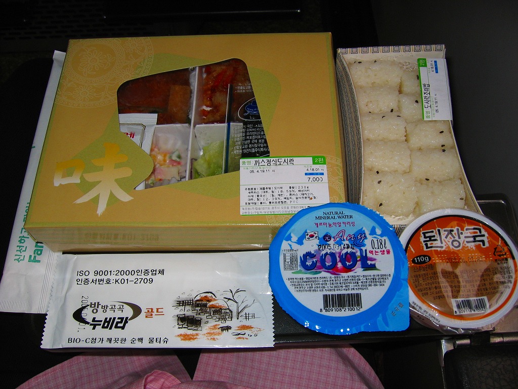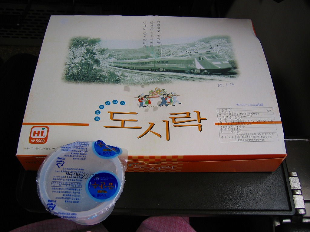 韓国でようやく出会えた駅弁らしい雰囲気の弁当に喜んだものの、中身で赤いものはこの世のものとは思えない辛さで、白菜とイカを除き残さざるを得なかった。これにチリソースまで付いているのだから恐ろしく、日本人との味覚の差は相当に大きい。なお、車内販売では箱入りサンドイッチも積んでいたが駅売りと同じ商品の模様。キンパブの車内弁当もあるそうだが、今回は見つからなかった。