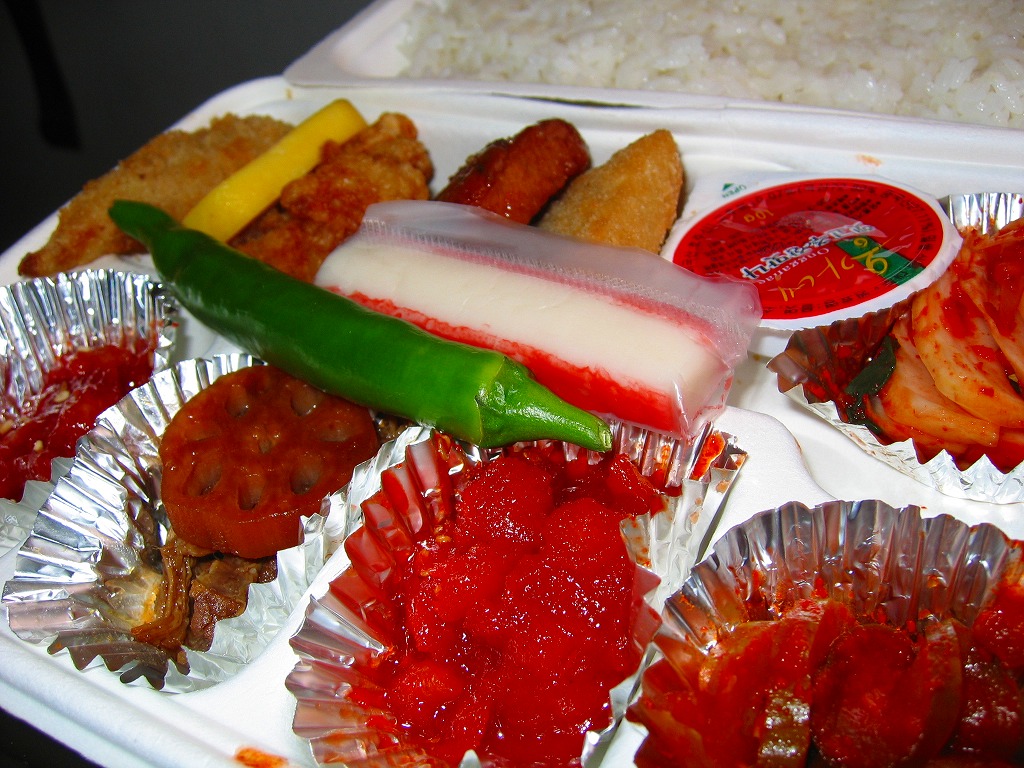 龍山発木浦行セマウル号の車内販売で購入したお弁当。KTX開業まで韓国鉄道の花形だったディーゼル特急セマウル号の写真を載せたボール紙の紙箱に、容器とトレーをひとつずつ詰める。中身はひとつが白御飯、もうひとつがおかずでその中身はミニエビフライ、蒲鉾のような玉子焼、鳥唐揚、魚照焼?、白身魚フライ、カニ蒲鉾、青唐辛子、白菜やイカなどのキムチ5種にチリソースのカップ。カップの水も付いている。