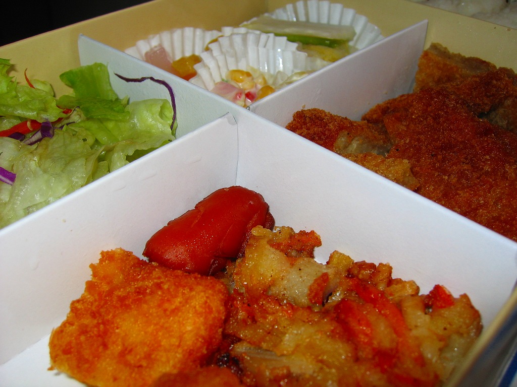 龍山駅のKTXやセマウル号などが発着するホーム上のファミリーマートで買ったお弁当。総ボール紙製の長方形の容器は松花堂風に四分割され、中身はマスタードソース付き生野菜サラダ、白菜漬とカニカマコーンサラダと缶詰フルーツ、かき揚げとウインナーと玉子焼に何かの揚げ物、ハンバーグかカツか粉モノかよく分からない揚げ物。上のプルコギトシラックと同じ俵飯と水と味噌汁?が付く。