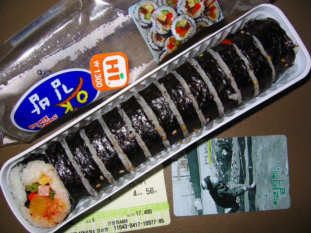 2005年の訪問時にソウル駅のキオスクで見付けた、1種のみ取り扱いの韓国風海苔巻。ハムと人参と玉子焼とキャベツ?とキムチ?を、塩気と油気がある韓国風海苔で巻いた、日本の細巻と太巻の中間くらいの太さで長さは20センチ程度のキンパブ(韓国風海苔巻)1本をトレーに入れてビニール袋に入れる。味は辛くなく、御飯も具も軟らかく風味がよく分からない感じ。