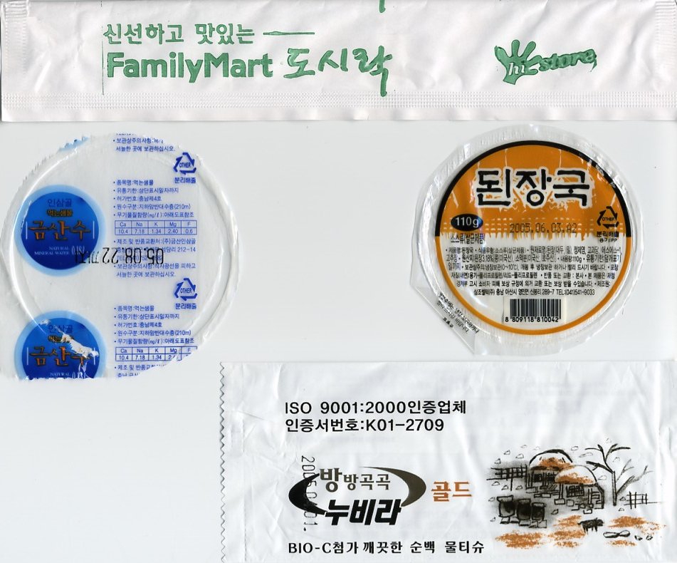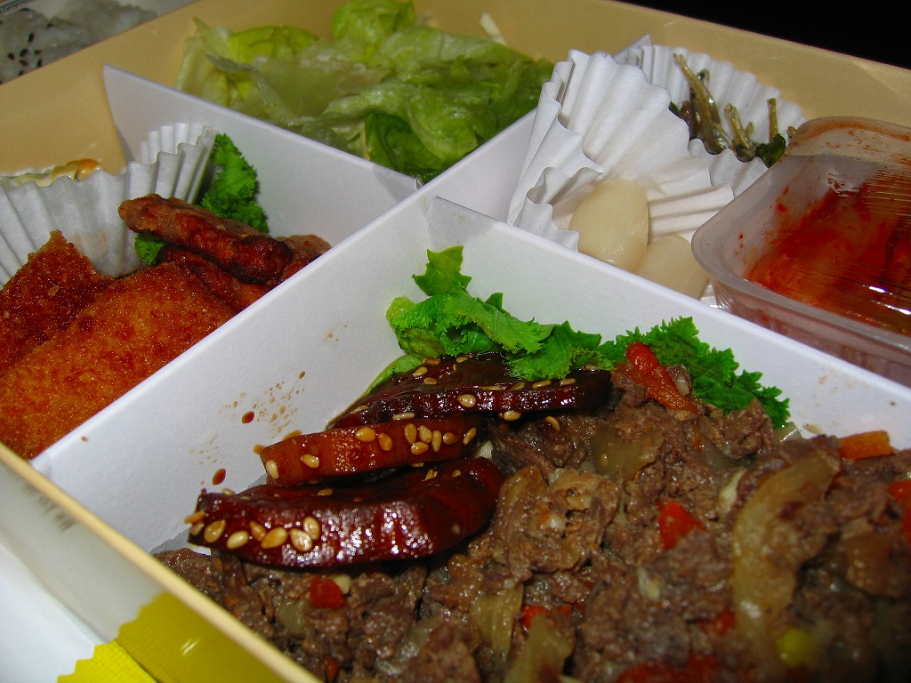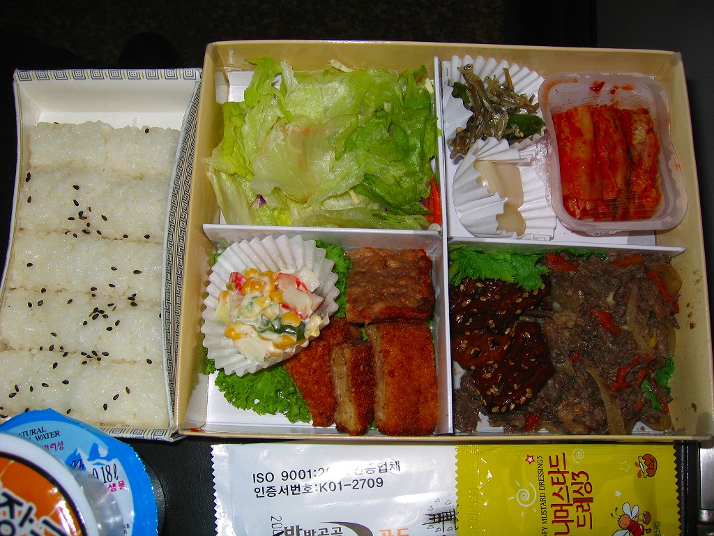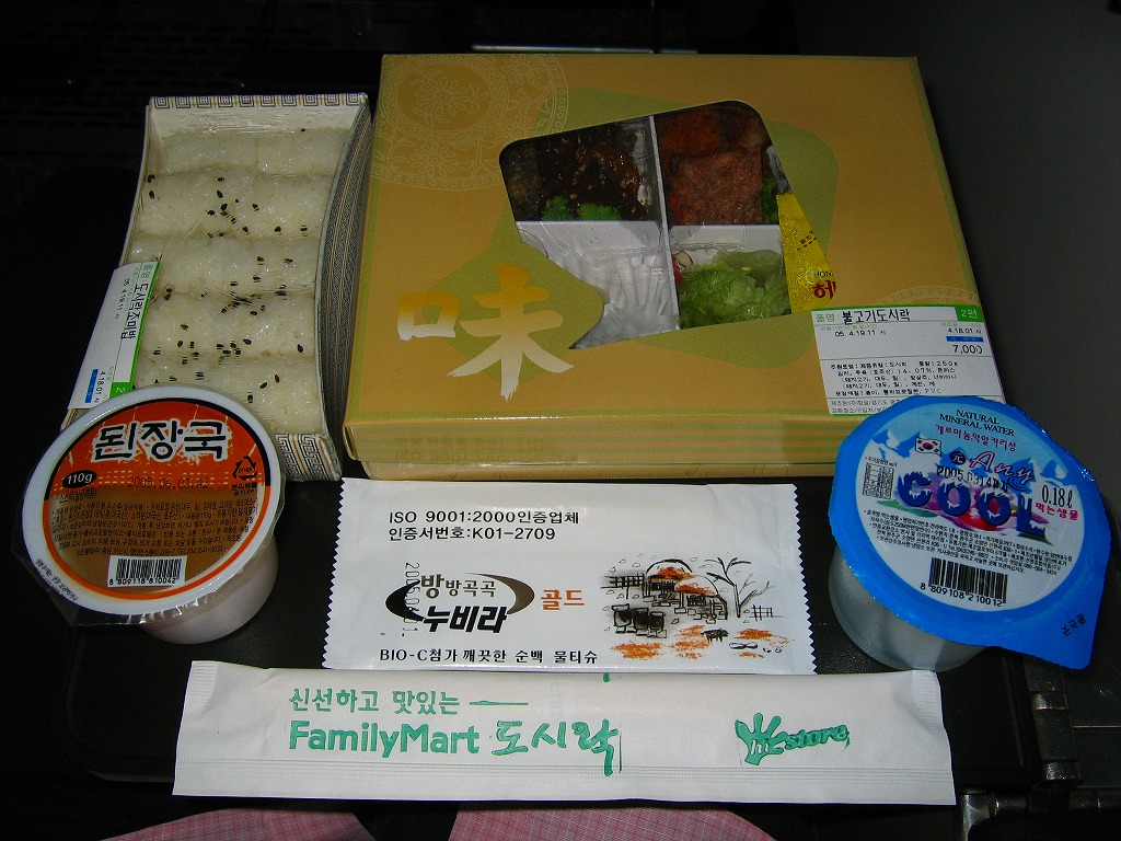 ソウル市にある龍山駅の、KTXやセマウル号などが発着するホーム上のファミリーマートで買ったお弁当。総ボール紙製の長方形の容器は松花堂風に四分割され、中身は生野菜サラダ、キムチ・ラッキョウ・小魚和え、何かの揚げ物数種とカニカマコーンサラダ、牛すき焼き肉とレンコン煮。これに別のラップ包み紙箱で俵飯を、航空機内食風プラ製カップで水と味噌汁?を付ける。