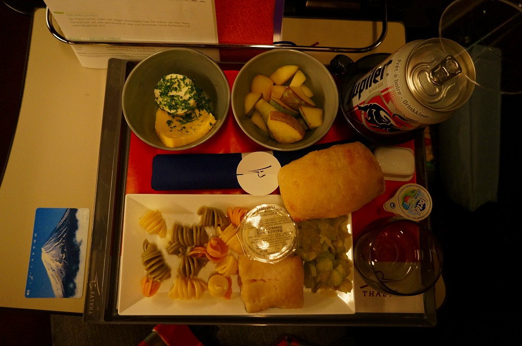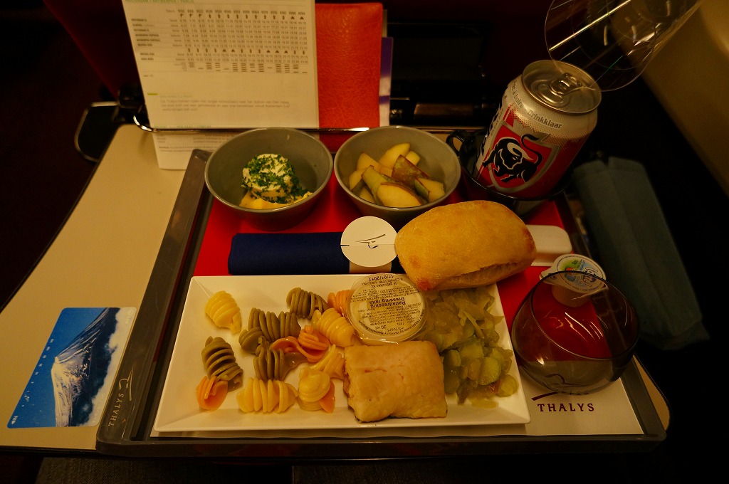 オランダのアムステルダムからフランスのパリへ向かうThalysの1等車に乗っていたらもらえたおつまみ。ベルギーのブリュッセルを過ぎた所で提供された。内容はねじ状のパスタ、白身魚、豆サラダ、ねっとりしたパン1個、チーズ2種、リンゴを刻んだもの。トレーにも紙ランチョンマットにもカップにも「Tharys」のロゴが描かれており、鉄道マニアとしてまとめて持ち帰りたくなった。飛行機と違い、金属製のフォークやスプーンにはロゴがなかった。