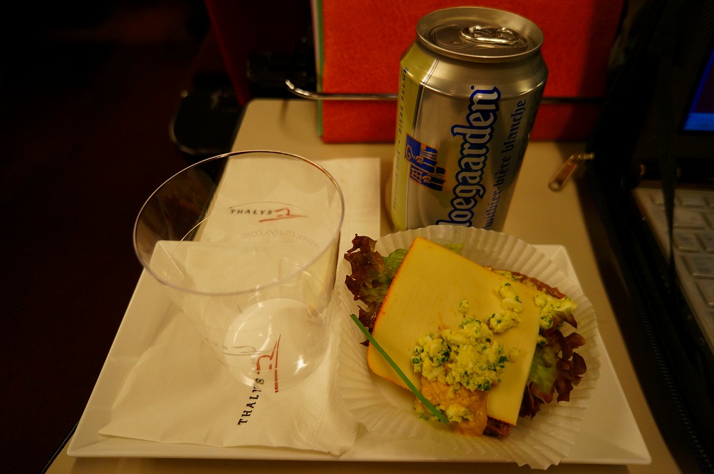 タリスでアムステルダムからパリまで3時間ちょっと。この日は午前中になかなか飯へありつけなかったため、乗車前にラウンジでビールとジュース、その前にラップサンドを1パック開け、この車中でベルギービールの350ml缶を3種空け、三角サンド2パックとサラダを食べ、直前に上記のおつまみをもらっていた。そこにこれが出たものだから、駅弁を一度に4個食べたくらいの満腹に苦しんだ。