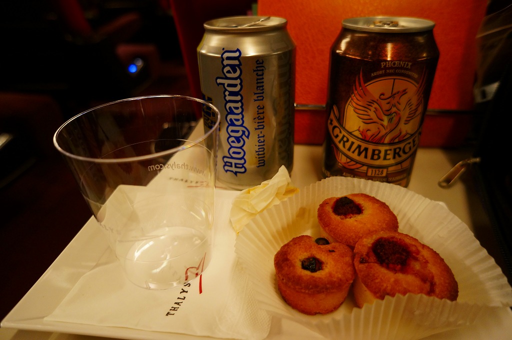 オランダのアムステルダムからフランスのパリへ向かうThalysの1等車に乗っていたらもらえたおつまみ。途中のベルギーのブリュッセルまでは車内が空いていたため、客室乗務員のおじさんからビールを2缶もらい、6種類のおつまみの中からふたつを得た。ひとつはチーズクラッカー、もうひとつはベリーのスポンジケーキ。3か国を経由する列車の中のものだが、ビールの銘柄がベルギーであったため、ここに収蔵した。
