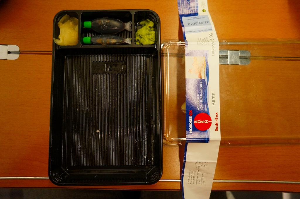 ドイツ国内でついに発見した欧州の駅弁。ではなく、ドイツで115年の歴史を刻む魚介類レストラン「NORDSEE」の惣菜屋で販売されている寿司。単独の冷蔵ケースに6、8、10ユーロと3種類あった商品のうち、最も高いものを選んでみた。惣菜向けプラ製容器を、ブランド名を印刷し食品表示を印字した紙製シールの帯で留める。「竹の香り」と袋に書かれた割りばしは日本向けのようで、「紙」のリサイクル識別表示まで付いていた。