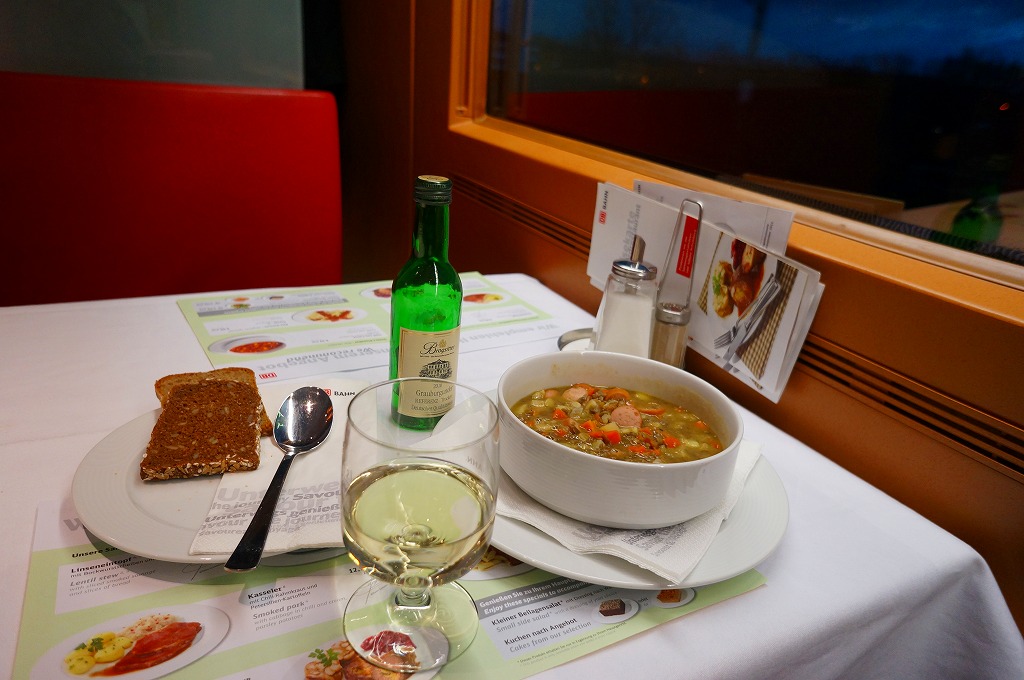 ドイツ版新幹線「ICE」の食堂車で注文した料理。ランチョンマットを兼ねた紙製メニューや、1等車座席に備わるオーダーメニューでも写真入りで掲載されていたため、このときのおすすめメニューなのだろう。料理名は「レンズ豆のスープ」だそうで、陶製の食器にポテトやソーセージやニンジンやタマネギなどを刻んだものと、ダイズより少し大きな豆が、ビーフ味の茶色いスープで煮込まれていた。パンが付いて、ミニボトルの白ワインも注文して16.2ユーロ。