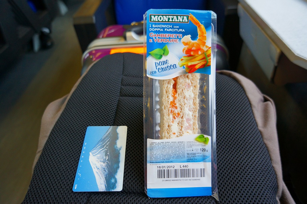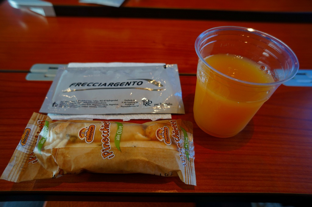 ベネチア・サンタルチア駅からボローニャ駅まで乗車したイタリアの高速列車「ユーロスター・イタリア アルタ・ヴェロチタ」で配布された軽食。ドリンクとスナック状のパンをもらえた。