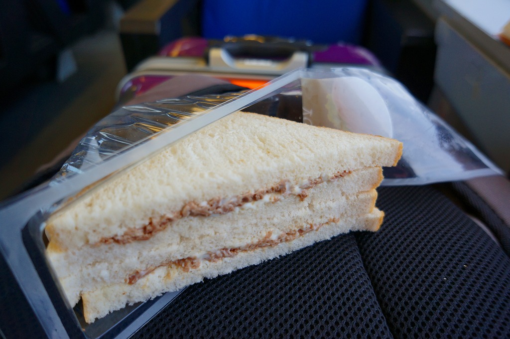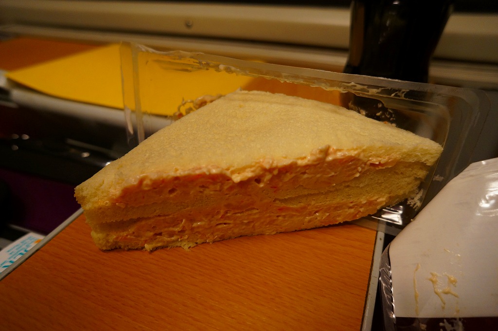 ボローニャ中央駅の地下通路内で、飲料や菓子とともに自動販売機で売られていた三角サンド。きんぴらのような生野菜スティックを混ぜたエビマヨサンドが2切れ、プラ製ケースに収まる。日本のコンビニサンドより固さと大きさと粒状感があった。調製元は鉄道向けケータリング会社を傘下に持つイタリアの食肉会社か。
