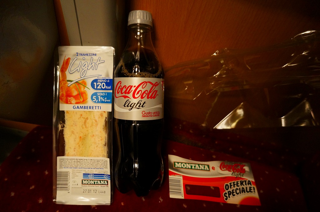 ローマ・テルミニ駅のウォークイン型ミニ食料品店で販売されていたセット商品。エビマヨの三角サンドとコカコーラライトのペットボトルが、透明なプラ製ケースに収納されていた。他にトマトサンドと無印のコカコーラをセットした商品もあったが、バルセロナと違い売り場での存在感は小さかった。