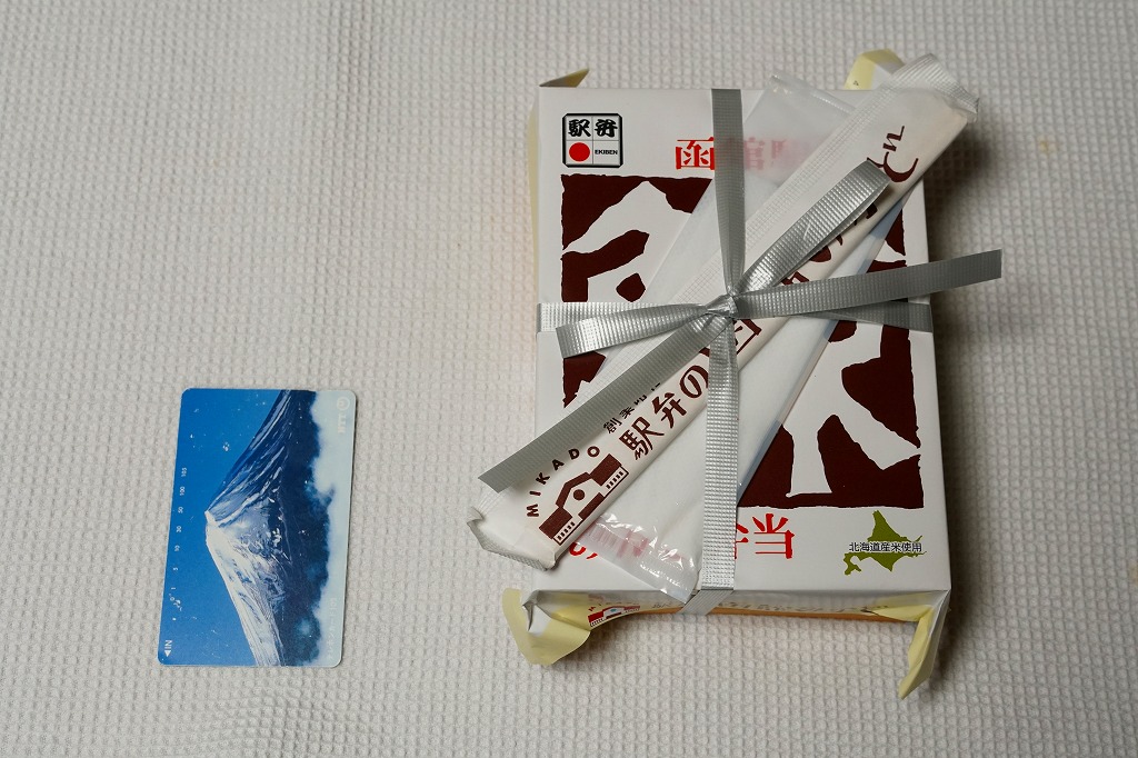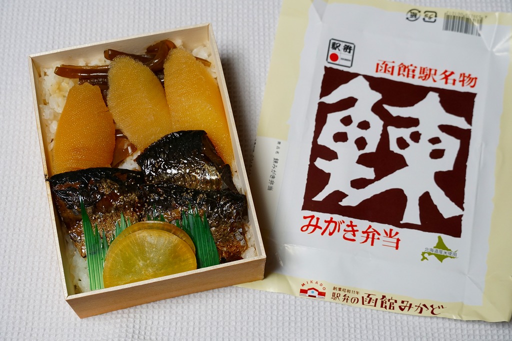 1966(昭和41)年の発売。函館駅で定番の駅弁。長方形の経木枠の容器に木目柄のボール紙でふたをして、ニシンの漢字を大きく描いた掛紙をかけて、ひもで十字にしばる。中身は白御飯の上をニシン甘露煮と味付けカズノコで覆い、茎わかめと大根味噌漬を添えるもの。時の洗礼を受けた味わいには、古典の安心感がある。道南の箱館(現在の函館)・松前・江差はかつて蝦夷三湊と呼ばれ、ニシン漁で大いに栄えた。