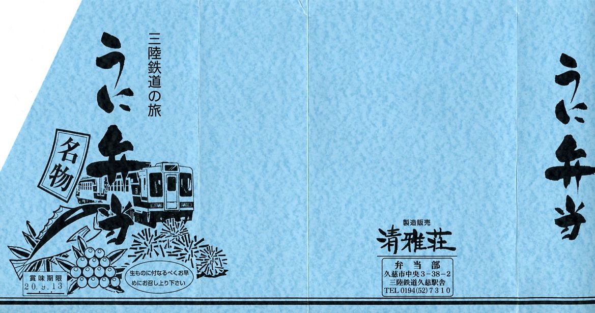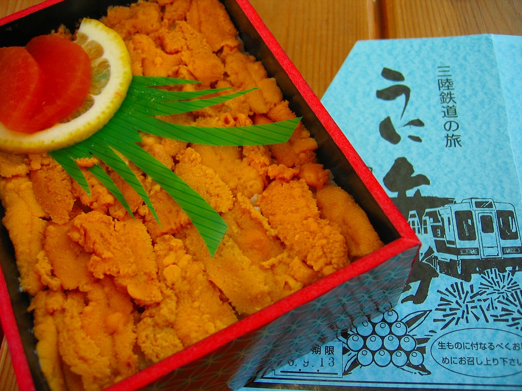 1986(昭和61)年7月26日に、三陸鉄道北リアス線の車内販売弁当として発売。日本有数の「幻の駅弁」であり、全国最強のウニ駅弁。赤い正方形の容器をラップで包み、木目調のボール紙でふたをして、三陸鉄道の列車やウニなどを描いた青い厚手の掛紙を巻く。中身はウニの混ぜ御飯の上を大量の蒸しウニで覆い尽くし、レモンとタクアンを添えるもの。