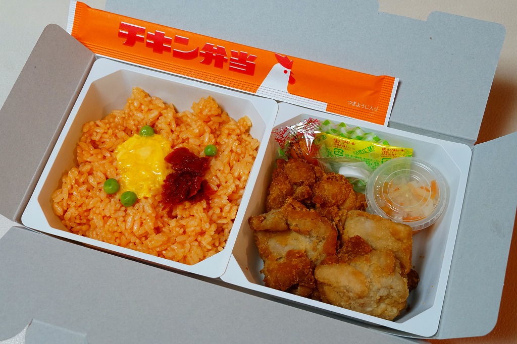 1964(昭和39)年10月に発売。現在の東京駅や上野駅で最も歴史が長く伝統のある駅弁。最近では2019(令和元)年10月にリニューアル。バスケット型とされるオレンジ色のボール紙製容器を使用、白いトレー2個に収まる中身は、1個が玉子とトマトのペーストやグリーンピースを振り掛けたケチャップ味のチキンライス、1個が濃厚な味の衣が付いた鶏唐揚、野菜のピクルス、スモークチーズ、レモン汁の袋。御飯や鶏肉に、懐かしい家庭料理の味がする。
