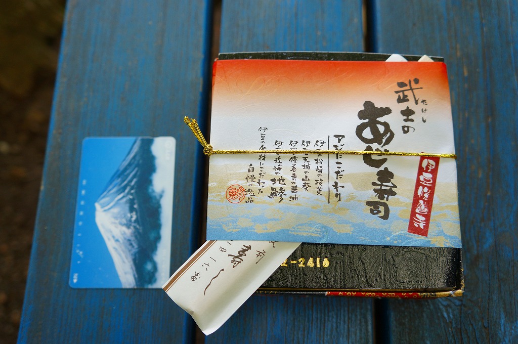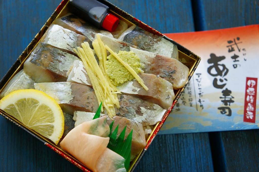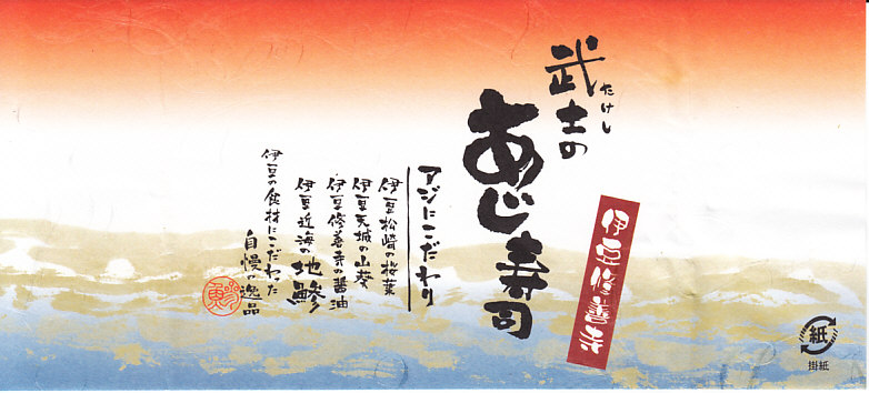 1999(平成11)年に発売。黒く小さく底が深い専用のボール紙製容器に、駅弁の名前や宣伝文句を記した小さな掛紙を巻く。中身は、限りなく白御飯に近い感じの酢が薄い酢飯の上に、限りなく刺身に近い感じの酢が薄い鯵の酢締めをたっぷり折り重ねて、松崎特産の桜葉塩漬けにレモンスライスを添えるもの。胡麻や生姜や青ジソや醤油やワサビの風味も一切れ毎に楽しむことができる、噂どおりの絶品。