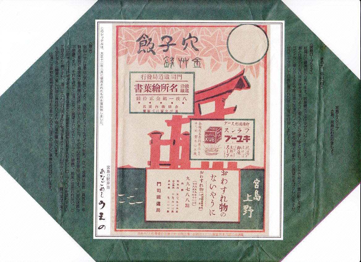 1968(昭和43)年に発売か。この駅弁のためだけに作られている、しゃもじ型の赤いプラスティック製容器を使用、これを中身の写真や商品名を大きく書いて、宮島の大鳥居のシルエットを描いたボール紙の箱に詰める。中身はカキ飯だし汁で炊いた御飯の上を錦糸卵、紅生姜、青のりで覆ったうえで煮カキを4個置き、カキフライ2個、カキの味噌和え、じゃこ煮、広島菜漬を添えるもの。10月頃から3月頃までの冬季限定発売。