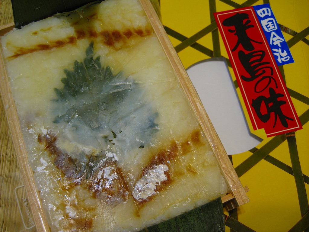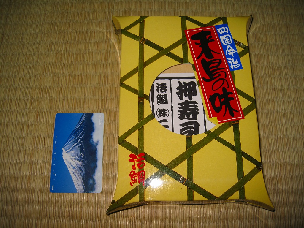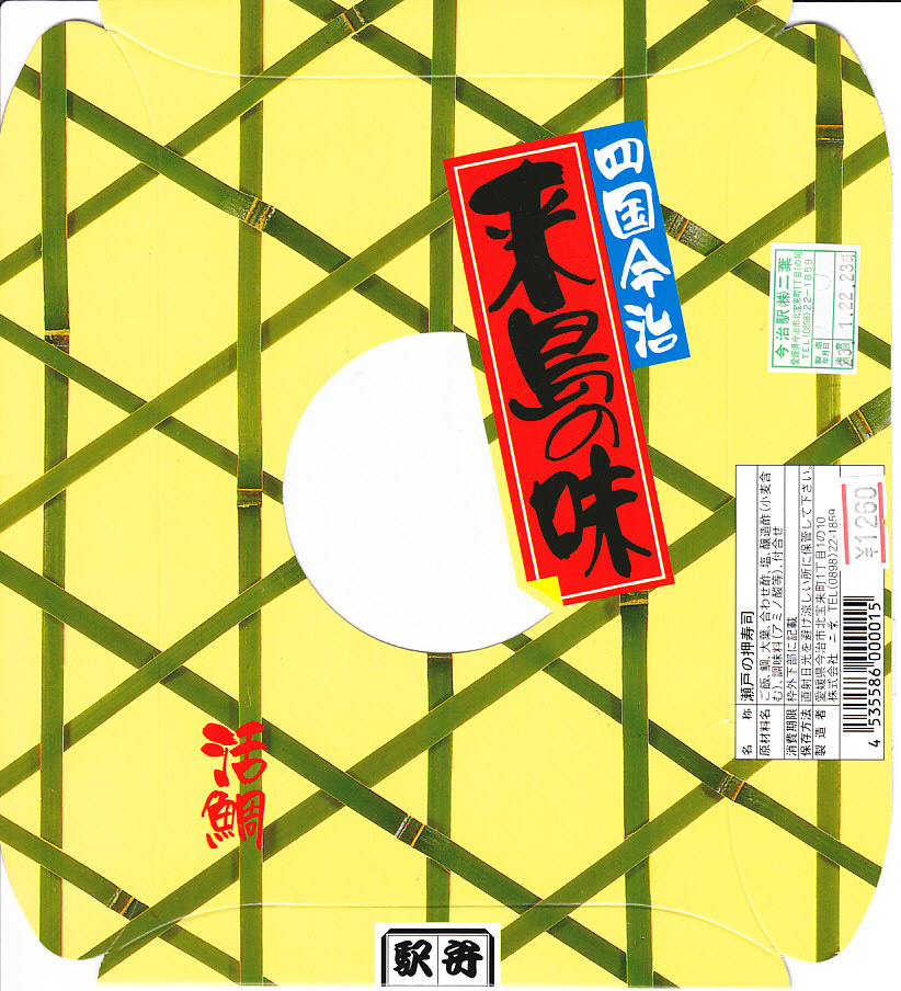 今治駅弁のフラッグシップ。1986(昭和61)年の発売か。押寿司の雰囲気がある、木枠がしっかりした長方形の容器を、ボール紙のパッケージに詰める。中身は容器に笹の葉を1枚敷き、酢飯を詰め、大葉を1枚貼り、タイの身を一面に敷き詰めるもの。全国の押し寿司駅弁で最も見た目が美しい駅弁ではないだろうか。