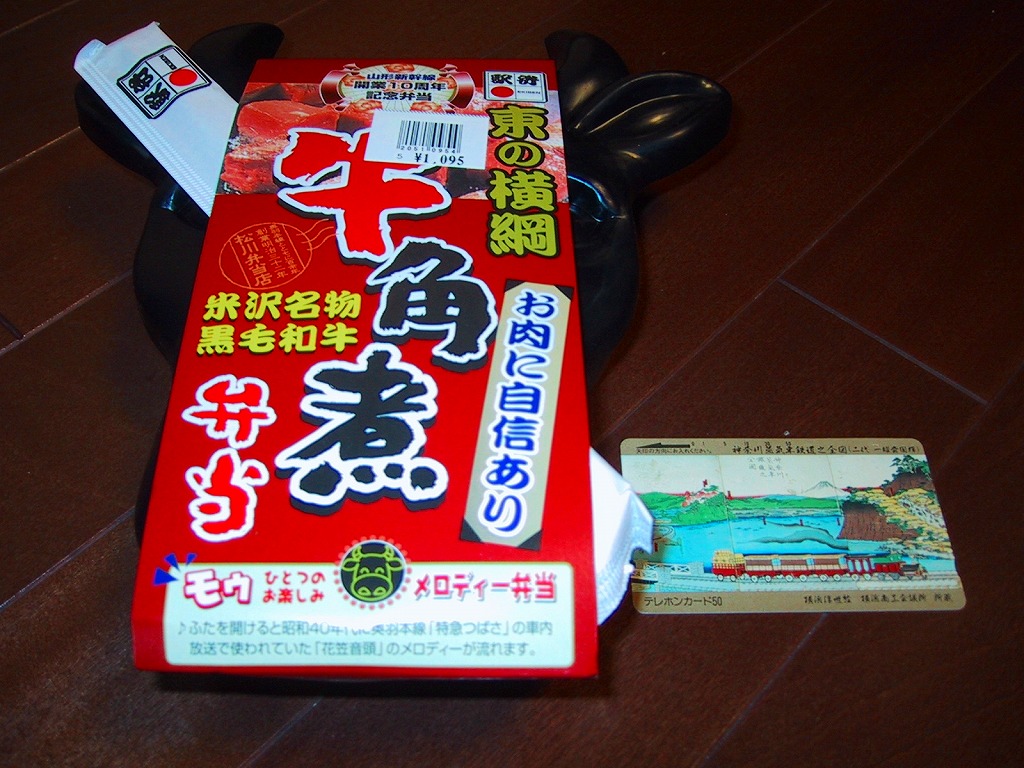山形県のJR奥羽本線米沢駅で駅弁を販売する松川弁当店は、2002(平成14)年の秋に新作の駅弁「牛角煮弁当」(1,150円)を発売する予定。日本初のメロディ駅弁とのことで、黒い牛顔型のふたを開けると電子音が鳴る。中身は白飯を米沢牛の牛角煮で覆うもの。三重県の紀勢本線松阪駅でも、同じ容器を使う牛肉の駅弁を発売。