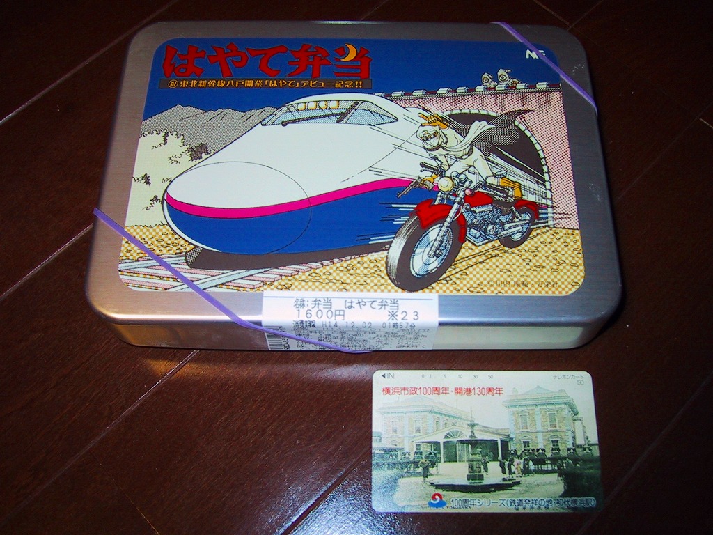 JR東日本の管内の駅や列車内で弁当を販売する日本レストランエンタプライズ(NRE)は、2002年12月1日(日)に新作の駅弁「はやて弁当」(1,000円)を、東京、上野、大宮、盛岡、八戸の各駅と新幹線「はやて」車内で発売。うち2万個は「はやて」型車両と月光仮面を描いたアルマイト製容器を使用した特別版として、1,600円で期間限定にて販売。