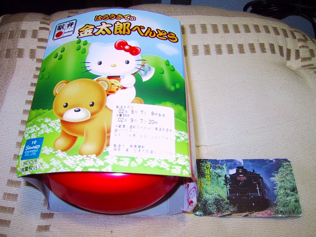 神奈川県のJR東海道線小田原駅など駅弁を販売する東華軒は、2002(平成14)年7月20日(土祝)に新作の駅弁「はろうきてぃ金太郎べんとう」(900円)を発売。前年の8月に発売した「はろうきてぃ鯛めし」に続く、小田原駅のハローキティ駅弁の第2弾。金太郎の前掛けでマサカリを持ったキティちゃんを象るプラスティック製立体容器に、ハンバーグや鶏照焼や海老フライなどを詰める。平塚駅から熱海駅までの各駅の売店などで販売。