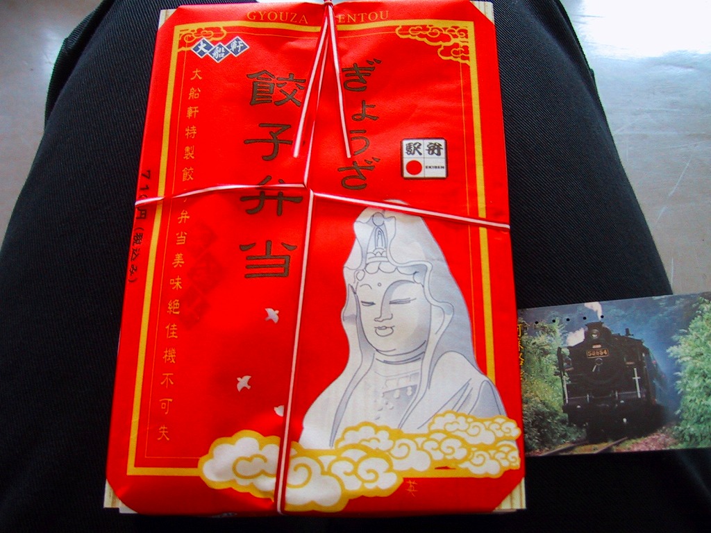 神奈川県のJR東海道本線大船駅などで駅弁を販売する大船軒は、2002(平成14)年3月29日(金)に新作の駅弁「ぎょうざ弁当」(710円)を発売。朱色の掛紙をかけた容器の中にぎょうざ5個と御飯その他を入れる。