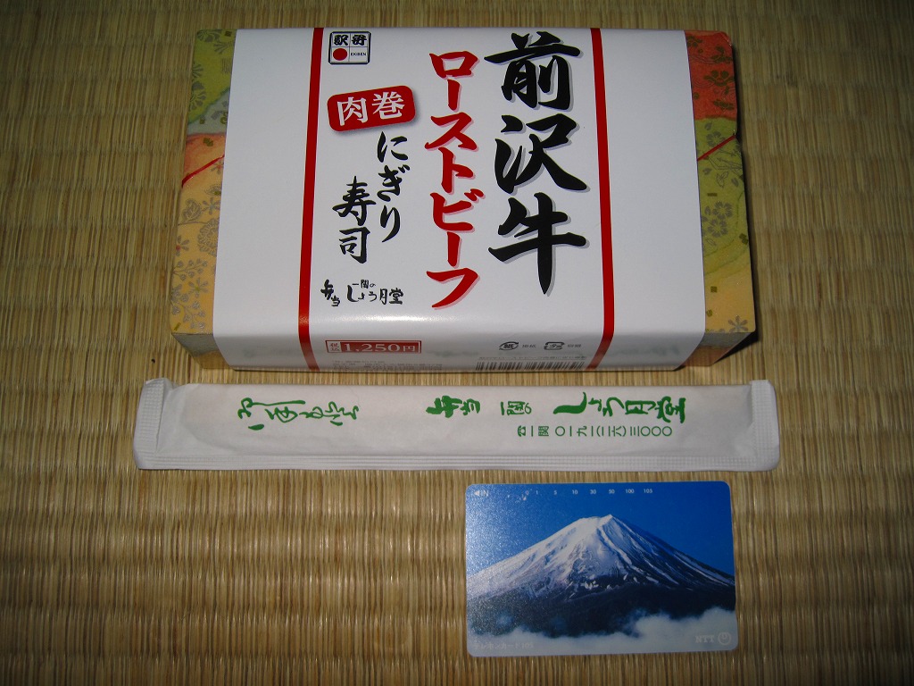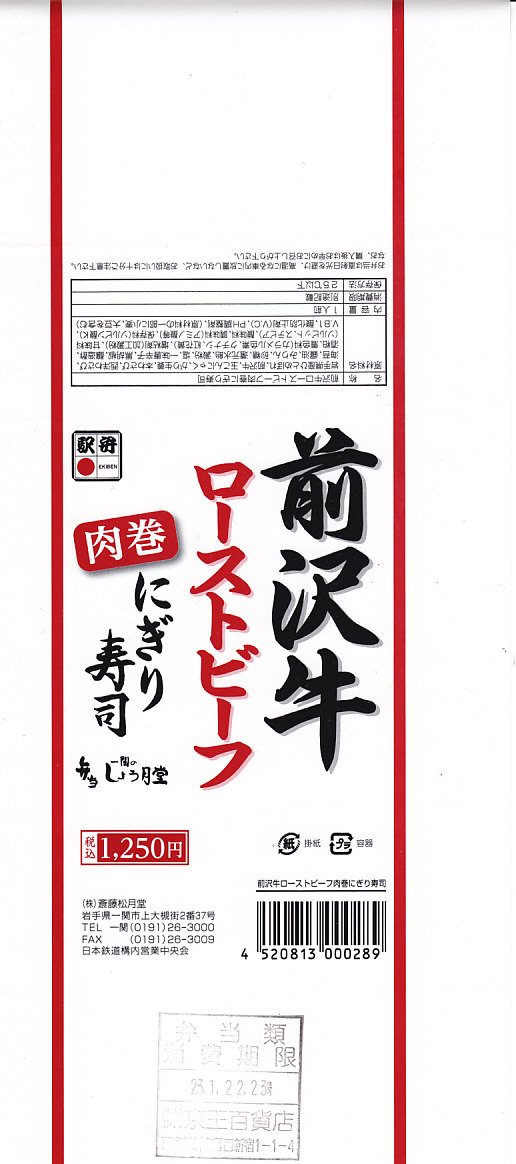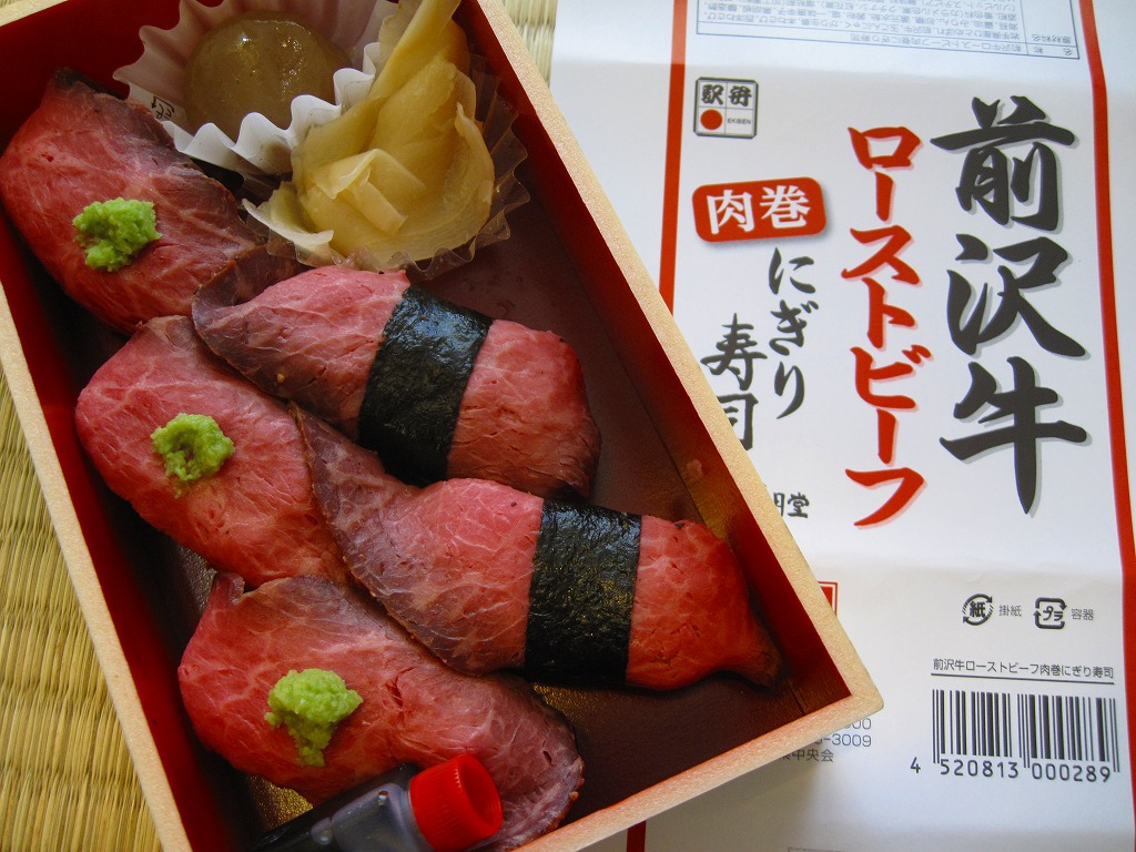 - 岩手県 東北本線 一ノ関駅「前沢牛ローストビーフ肉巻にぎり寿司」(1,350円)※斎藤松月堂
